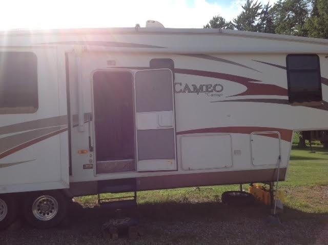 Take your next adventure in our 2009 Carriage Cameo today. This Fifth Wheel has a gorgeous White decal exterior complimented with an Earth toned interior. This Fifth Wheel has been meticulously maintained inside and out and has never been smoked in. There are many great features on this Fifth Wheel including: