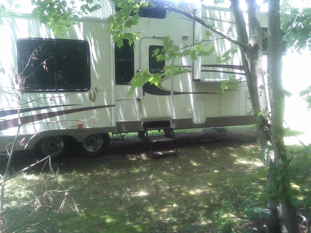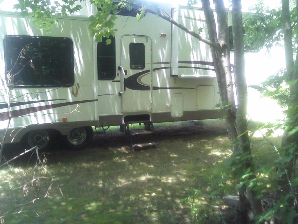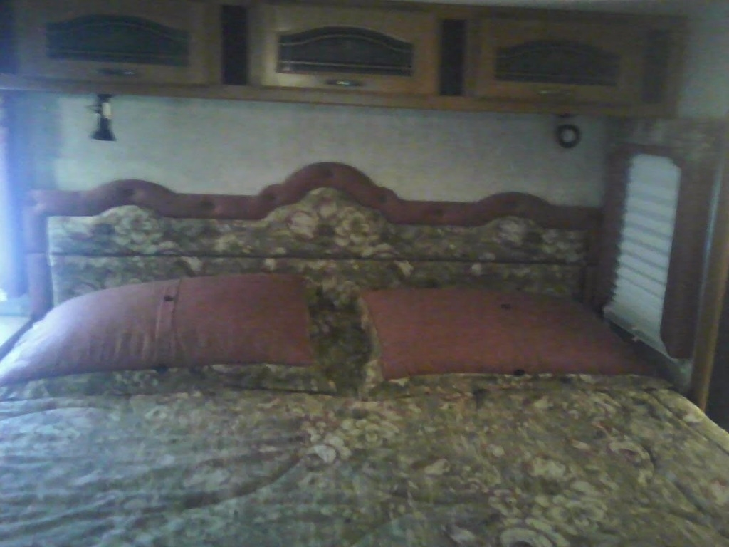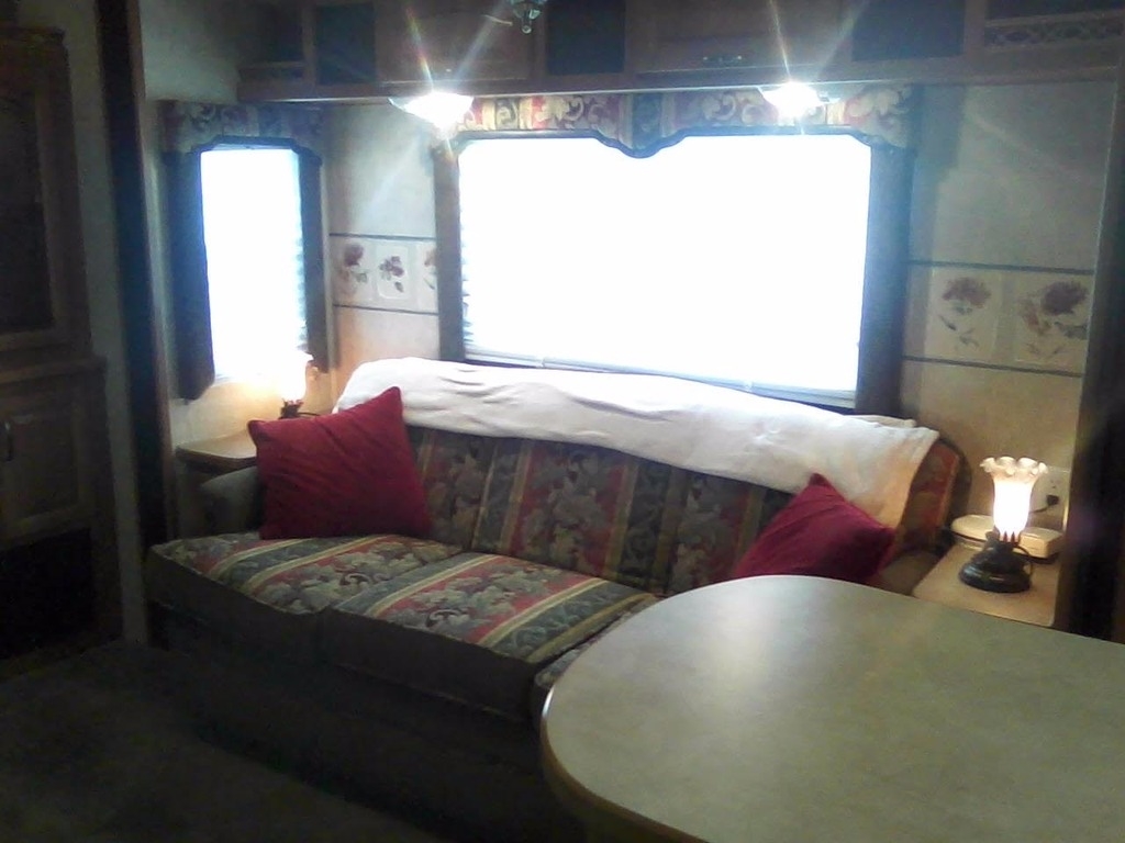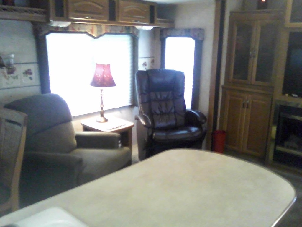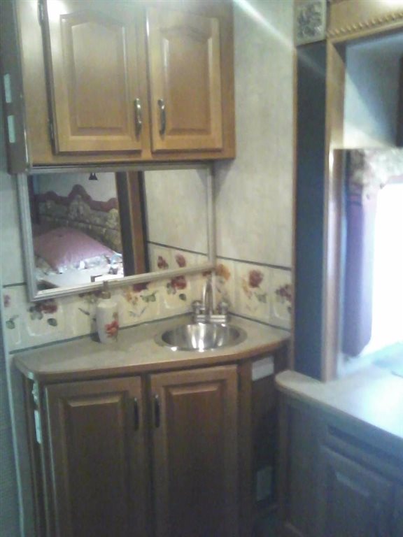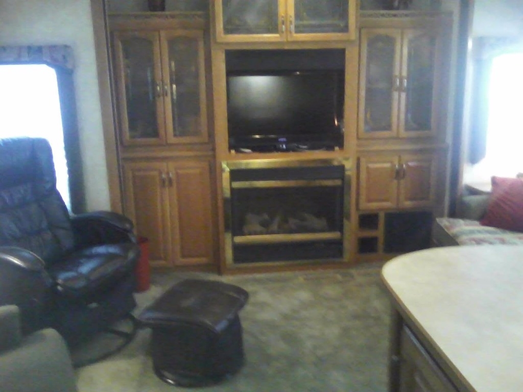 The Kitchen has a 3 Top Stove, Freezer, Refrigerator, Microwave, Double Sink, and Table with Chairs. The Living Room is Cable Ready, has CD/Stereo System, Upgraded Flat Screen Television, Surround Sound, DVD, 1 Recliner and a Sofa Sleeper. Other great features include: Inside Shower and Outside Shower, King Size Bed, Storage Dresser, Basement Storage, Electric Fireplace, Furnace, After Market Bedroom A/C, Skylight, Smoke Detector, Cover, and much more! It is excellent shape, very clean, cleanest RV on the campground. This RV has a very big bedroom, there is enough room in the bedroom to put a twin size mattress for the grand kids.
