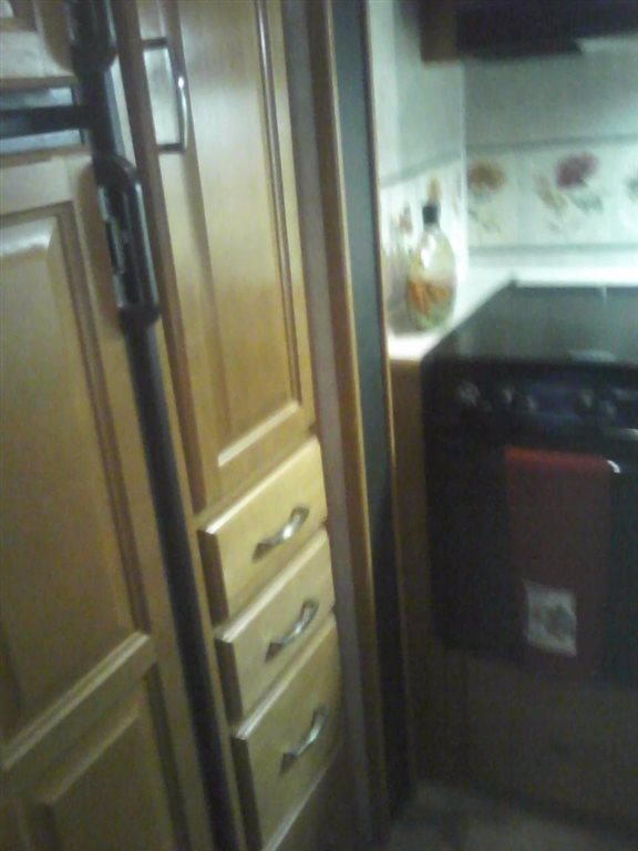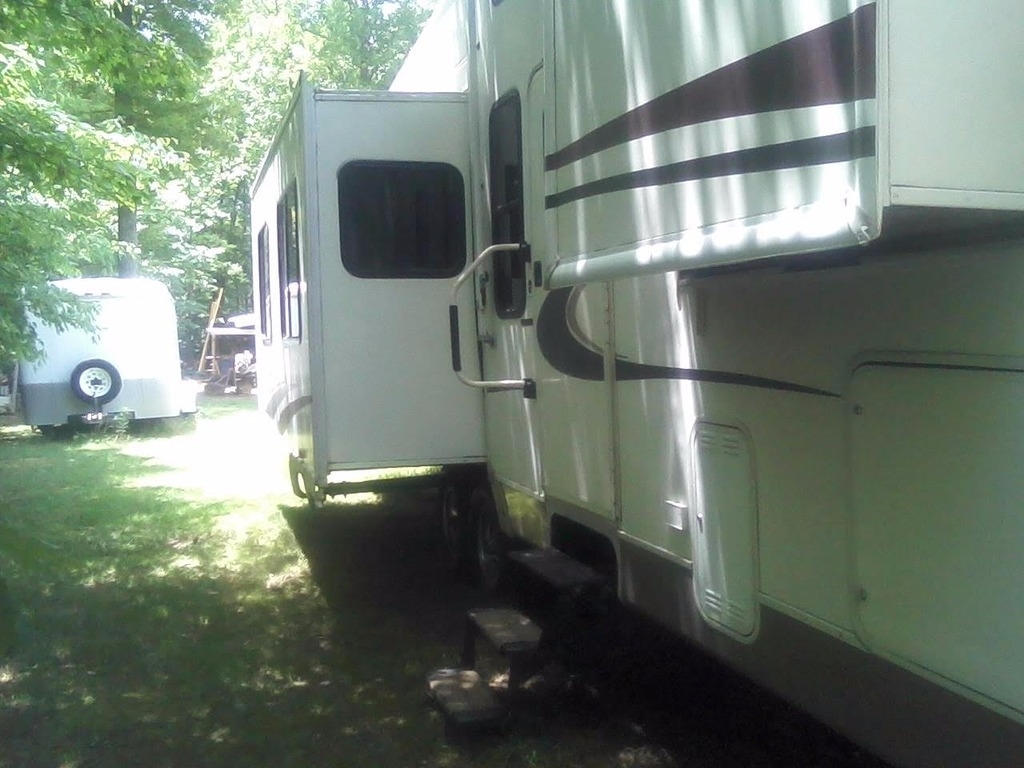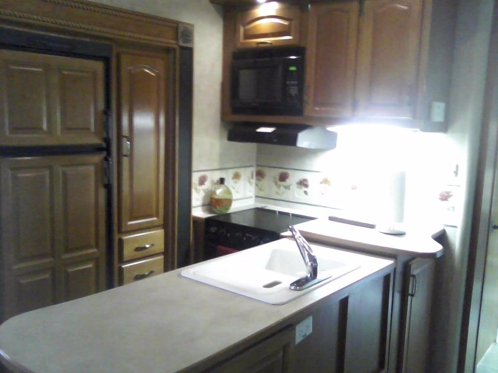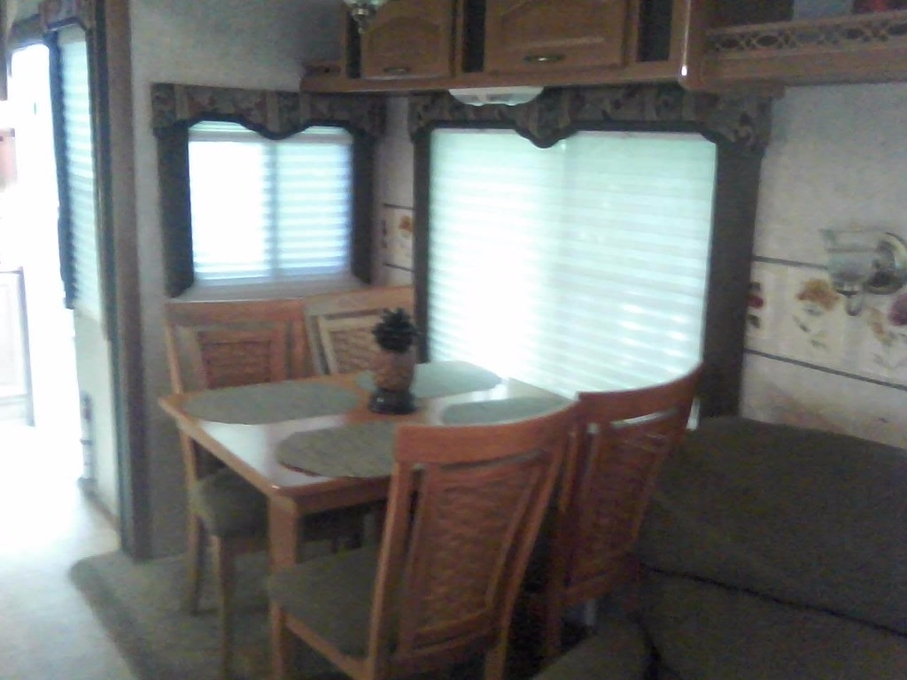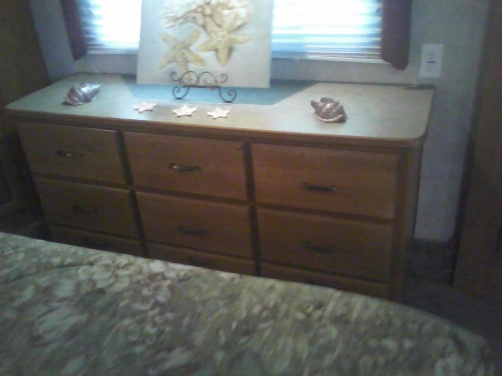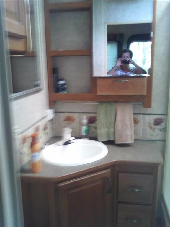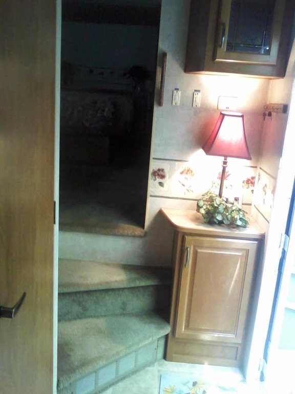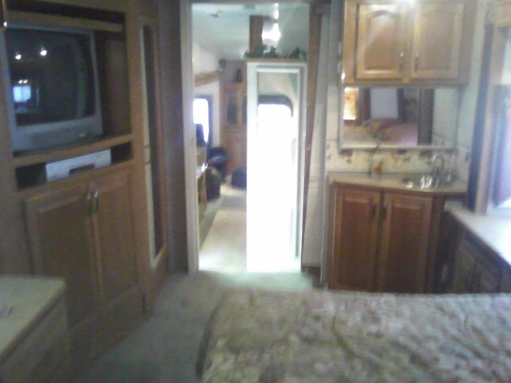 The Kitchen has a 3 Top Stove, Freezer, Refrigerator, Microwave, Double Sink, and Table with Chairs. The Living Room is Cable Ready, has CD/Stereo System, Upgraded Flat Screen Television, Surround Sound, DVD, 1 Recliner and a Sofa Sleeper. Other great features include: Inside Shower and Outside Shower, King Size Bed, Storage Dresser, Basement Storage, Electric Fireplace, Furnace, After Market Bedroom A/C, Skylight, Smoke Detector, Cover, and much more! It is excellent shape, very clean, cleanest RV on the campground. This RV has a very big bedroom, there is enough room in the bedroom to put a twin size mattress for the grand kids.