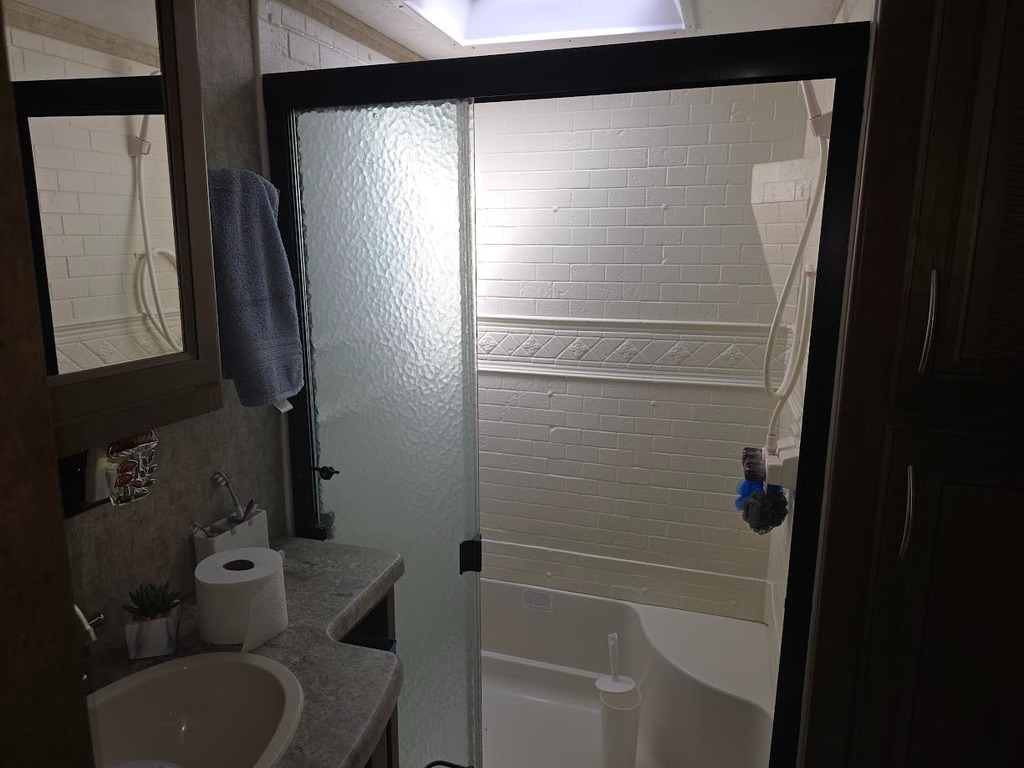 Bathroom with Porcelain Toilet, Shower (Glass/Plastic Door), Medicine Cabinet, and Skylight Vent