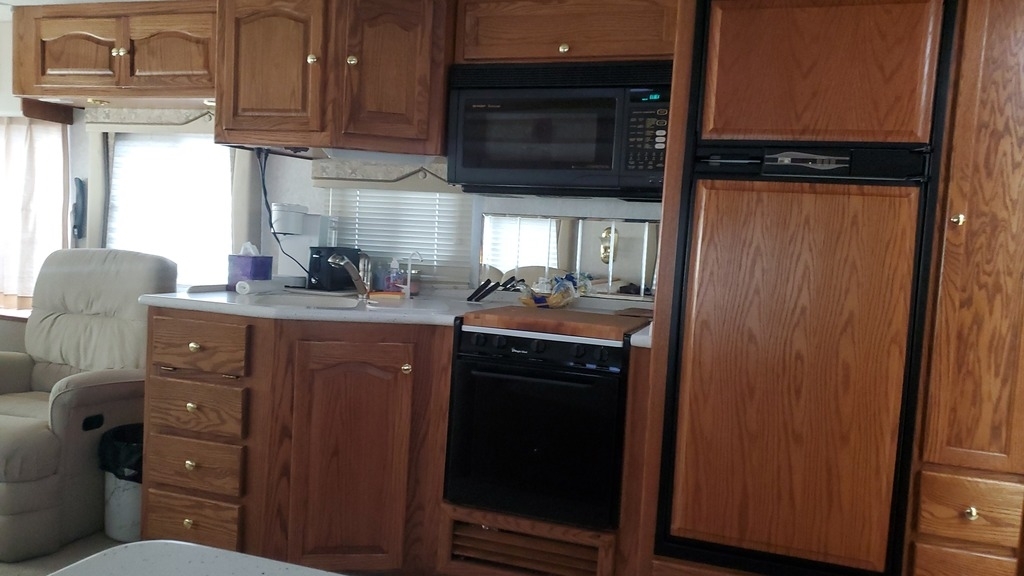 Oven/Stove, Microwave, And A Double Door Norcold Refrigerator, Split Bathroom