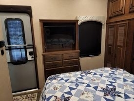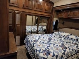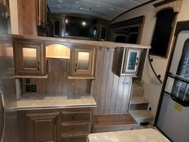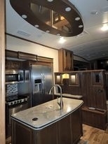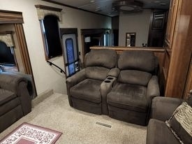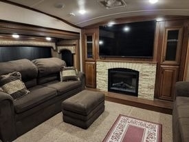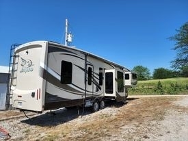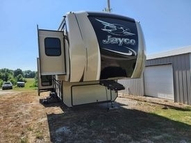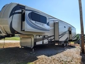 This 2016 Jayco Pinnacle 38FLSA Fifth Wheel is 42.08 feet long and comes equipped with five slide outs, a power patio awning, two air conditioning units, and can sleep six people comfortably.