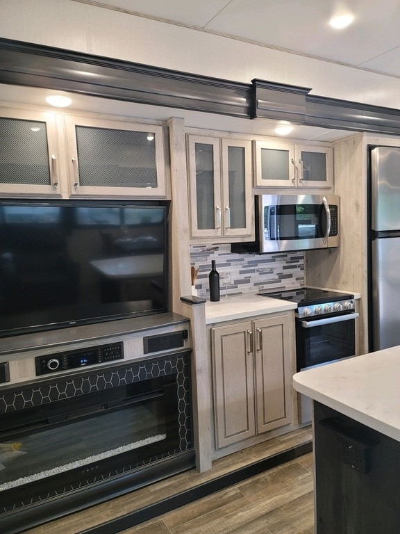appliances, a cozy living area with a large TV and fireplace, and a lavish