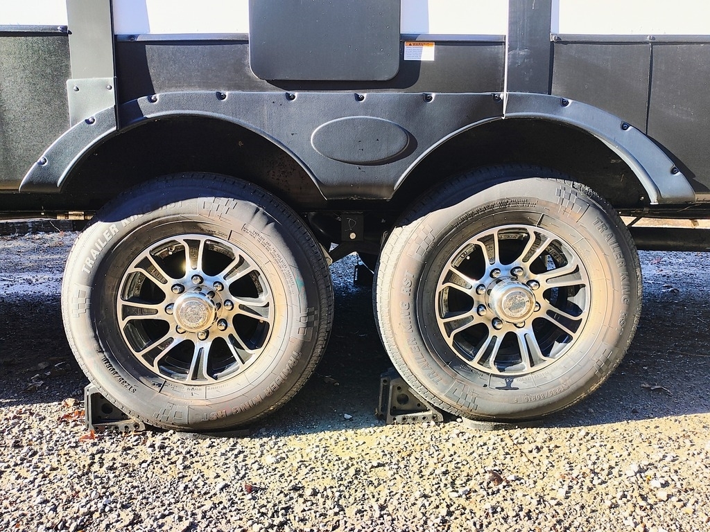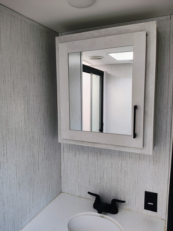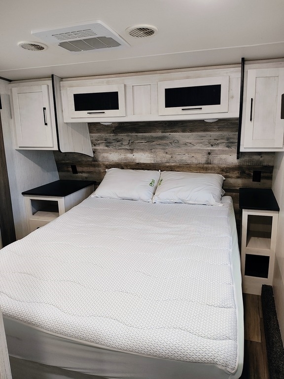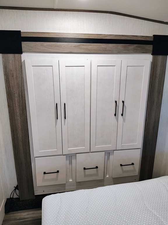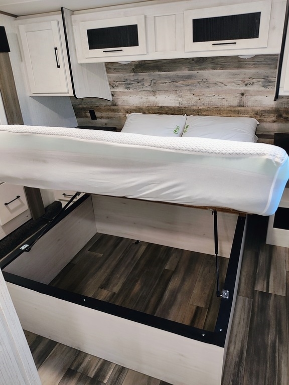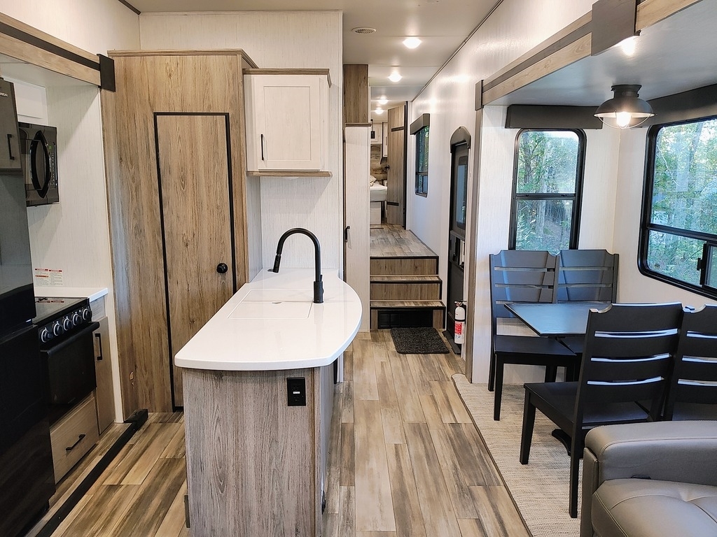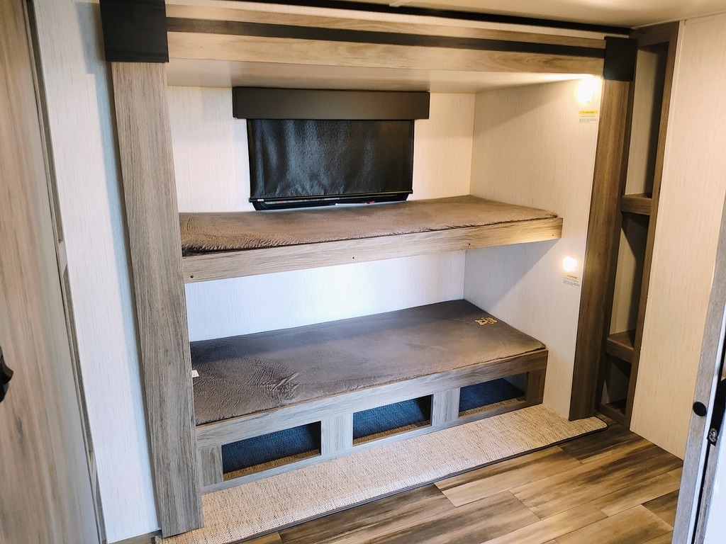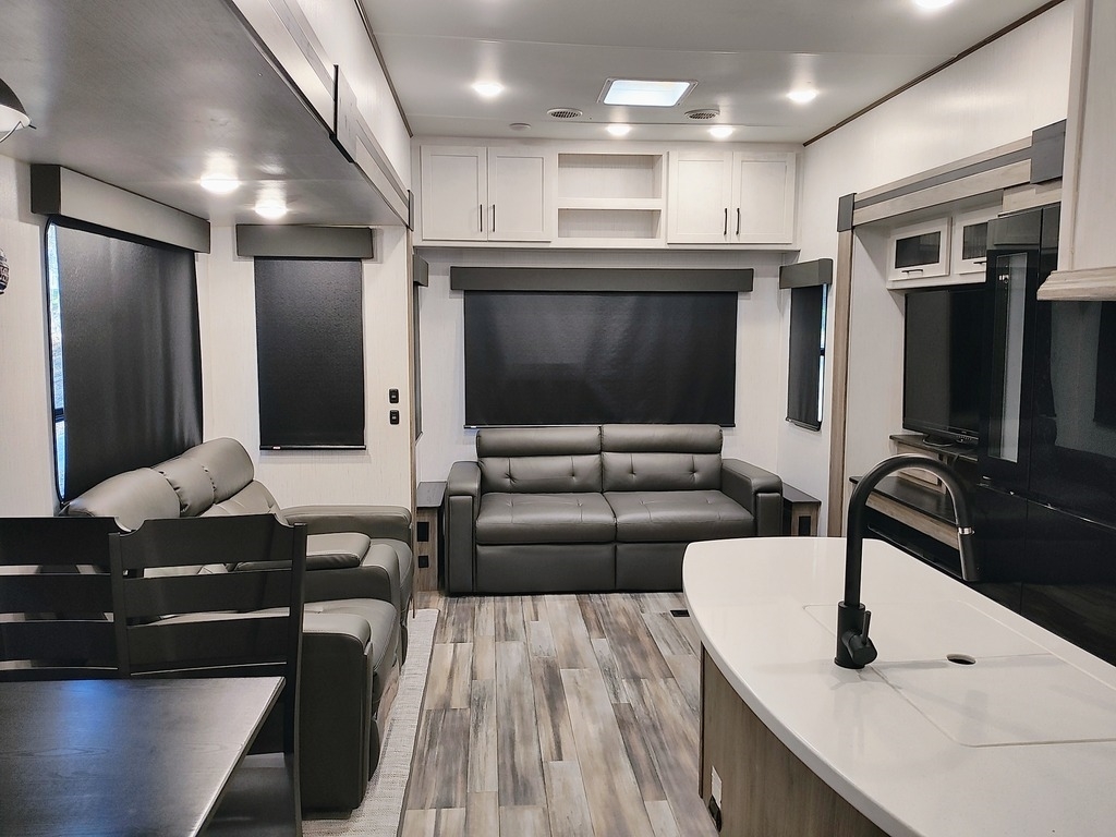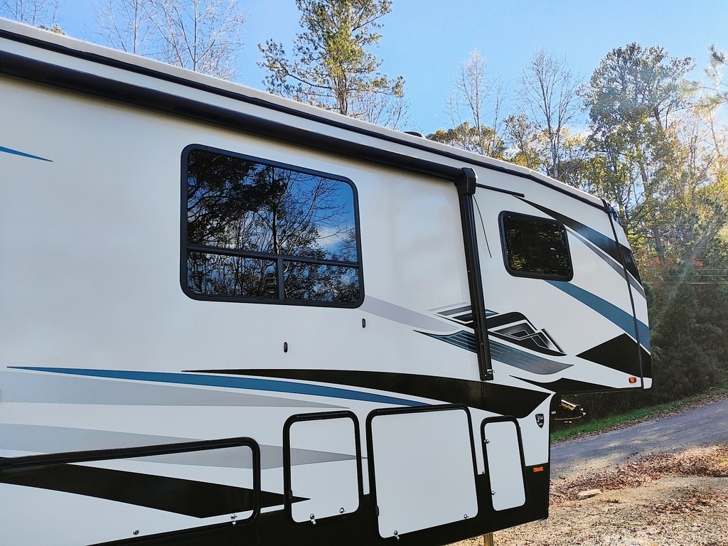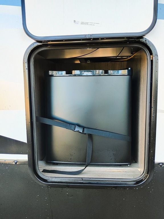 For added convenience, the exterior of the Milestone 377MB is equipped with a power retractable awning, exterior floodlights, and pass-through storage, extending the living space, and enhancing the outdoor experience. A spare tire located at the exterior and aluminum wheels ensure safety and convenience during travel. The luxury fifth wheel is constructed with aluminum body material and fiberglass sidewall construction, providing durability and reliability.