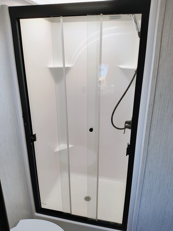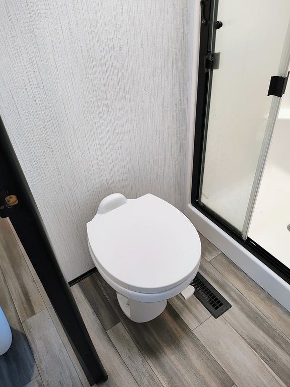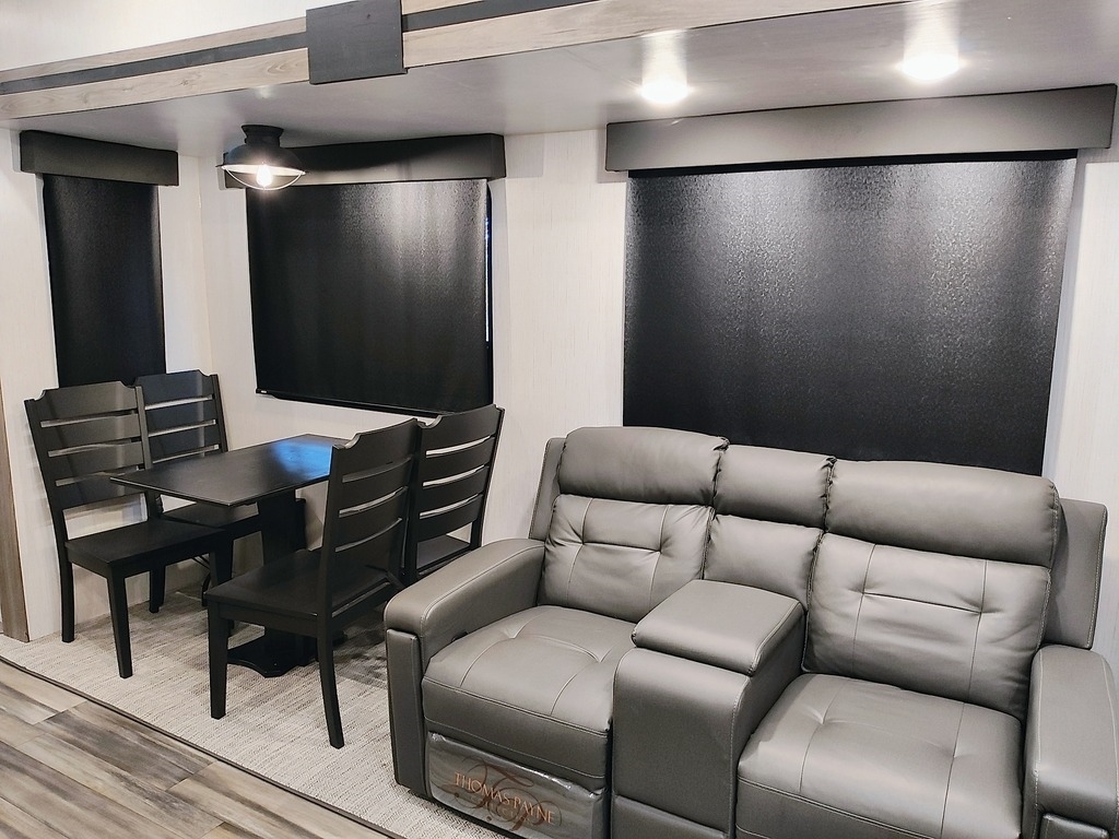 The interior is equipped with a range of features to ensure comfort and convenience. It includes a full-size master bedroom with a conventional door, vinyl flooring, and a sizable closet. Two bathrooms, with a plastic/glass shower door in one, porcelain toilets, and vinyl flooring, add to the luxurious living experience. The spacious interior also features a sofa, vinyl recliners, and a convertible sofa bed, providing ample seating and sleeping options. The living area is thoughtfully positioned at the rear of the unit, providing a cozy and private space for relaxation.