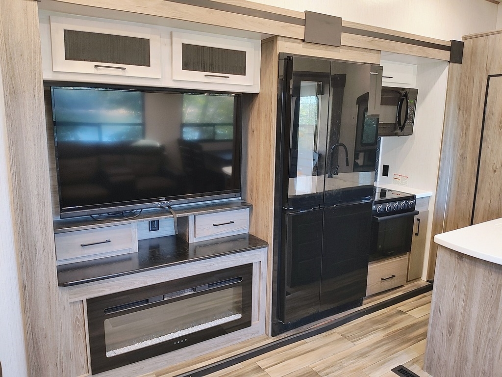 The kitchen is equipped with modern amenities, including a microwave oven, three-burner stove, full-size refrigerator, and vinyl flooring. The versatile kitchen layout with chairs and ample counter space makes meal preparation and dining a pleasant experience. The unit also boasts a fireplace, offering additional comfort and warmth, and air conditioning for temperature control. Additionally, the entertainment system includes a television, radio, and speakers, making it easy to relax and unwind.