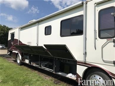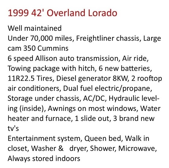 This 1999 Overland Lorado is powered by a Large Cam 350 Cummins Diesel Engine combined with a 6-speed Allison Automatic Transmission on a Freightliner Chassis, with under 70,000 Miles. The overall length is 42 feet and comes equipped with an 8kW Diesel Generator, 1 Slide Out, 5 Awnings, 2 A/C units, and Sleeps 4.