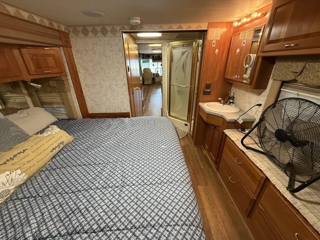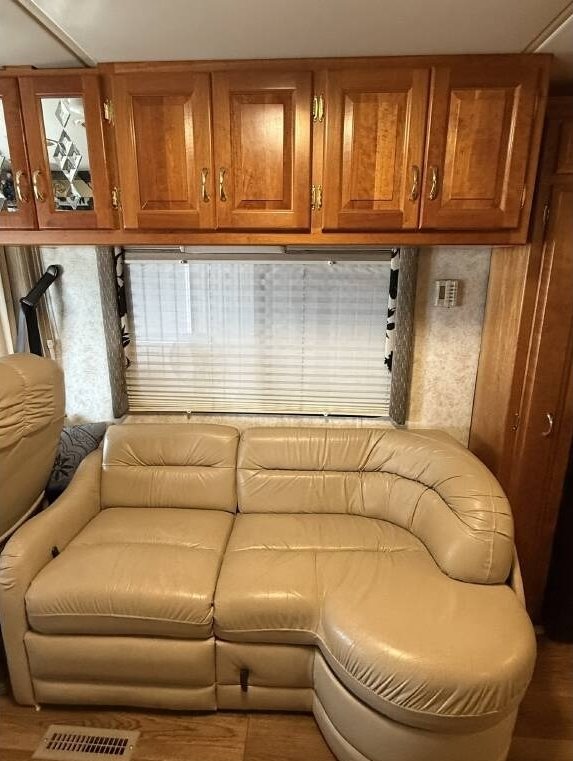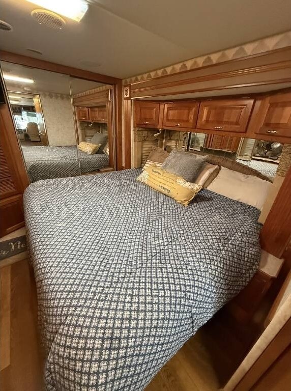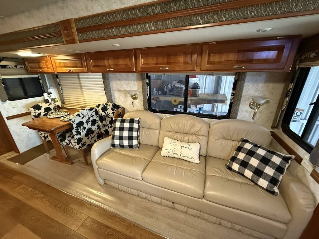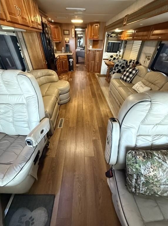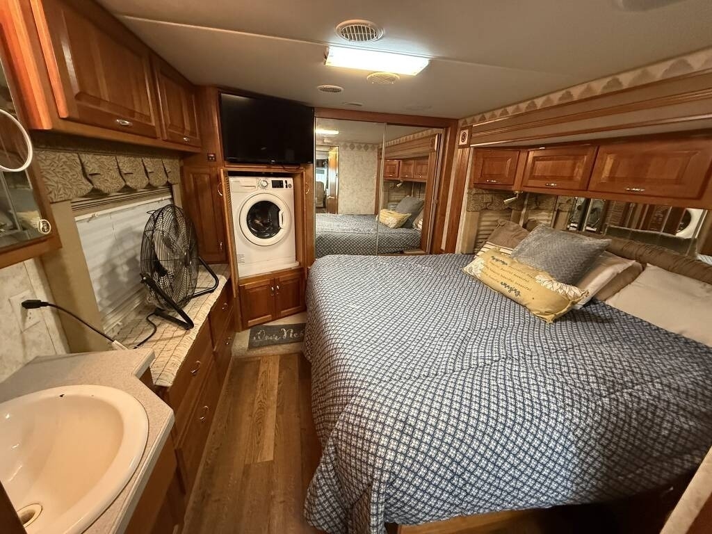 “This 2004 Newmar Dutch  Star Class A RV is a luxurious, well-maintained coach that's been kept in  enclosed dry storage and is in excellent condition. Powered by a strong 370hp  Cummins diesel engine with just 67,000 miles, it’s ready for many more  adventures. Inside, find a spacious king-size bed, a washer/dryer combo, two  separate bathroom sinks, and upgraded vinyl flooring throughout. The full-size  fridge runs on an inverter, offering convenience on the road, and the living  area includes a comfortable couch that converts into a full-size bed.  Entertainment is covered with two 32” Roku TVs. The Toyo tires are about 3  years old, with approximately 5k-6k miles on them. Please note, there is a  small rock chip in the windshield (manufacturer has stated it is fine), and the  entry steps are currently disconnected, however, they are still in working order.  The diesel generator slide tray also needs some attention. With a new battery  charger and high-end features, this Dutch Star delivers comfort, style, and  reliability for your travels.”