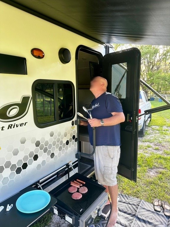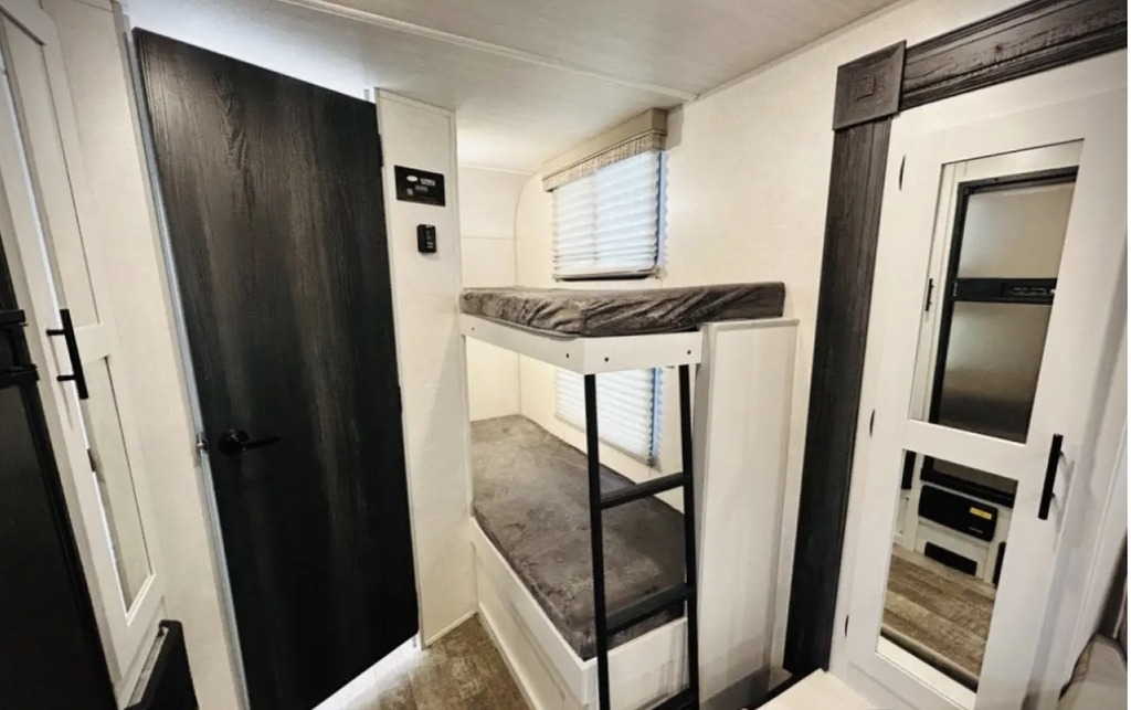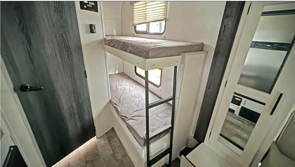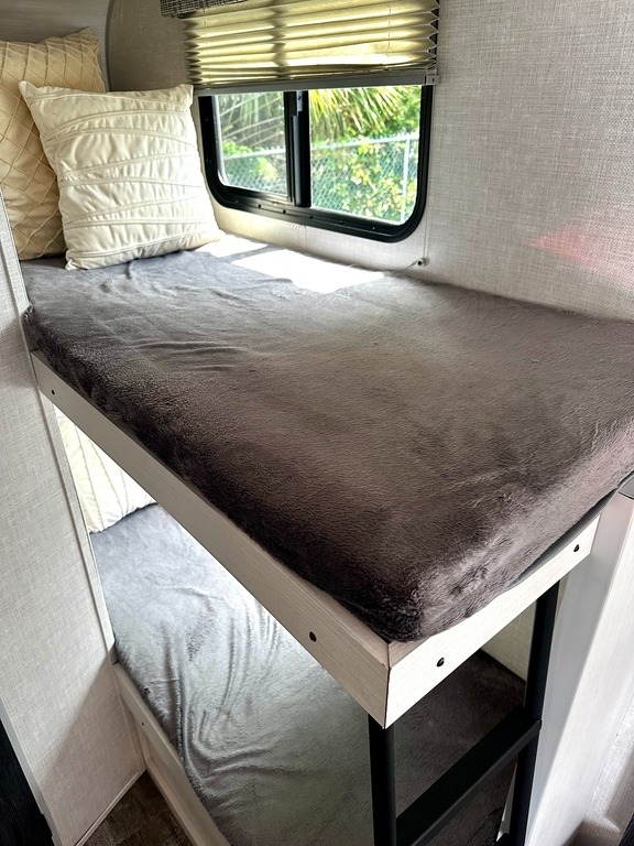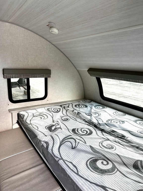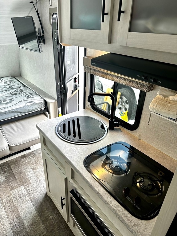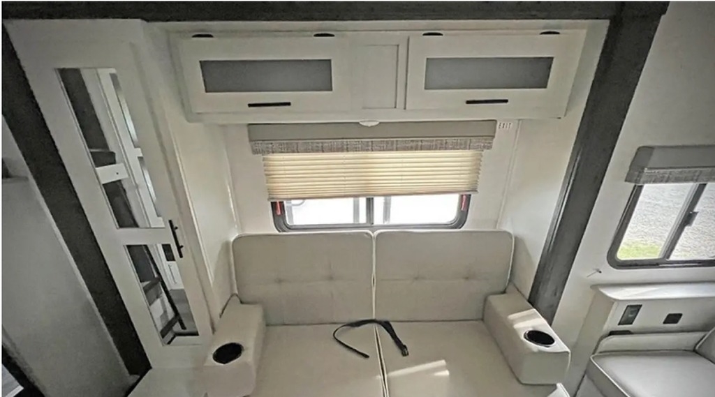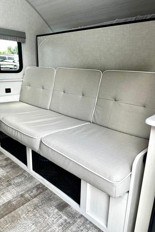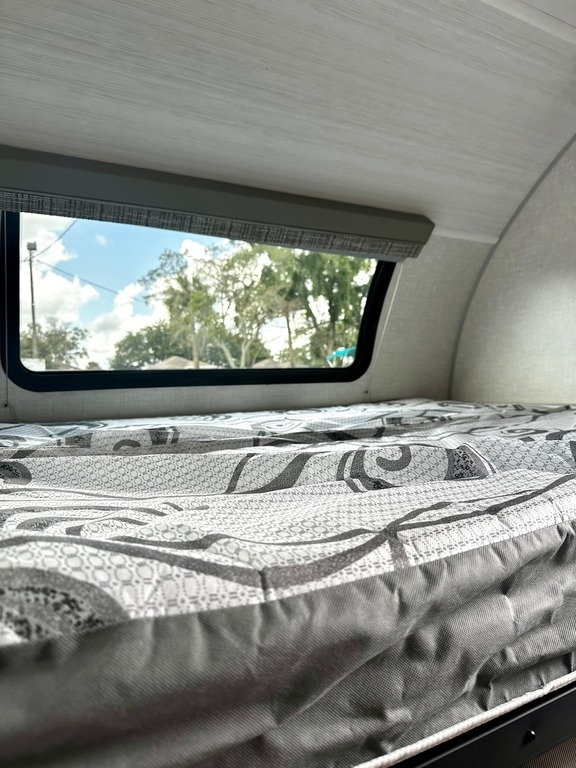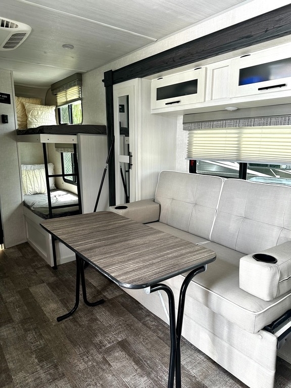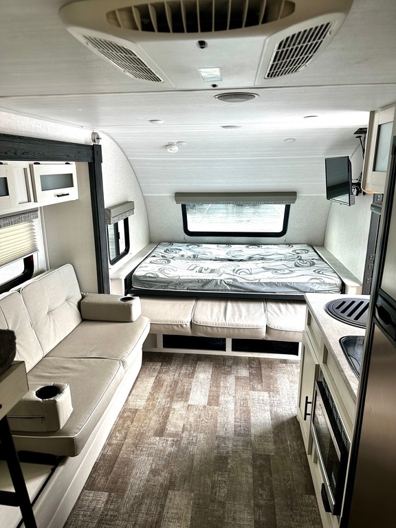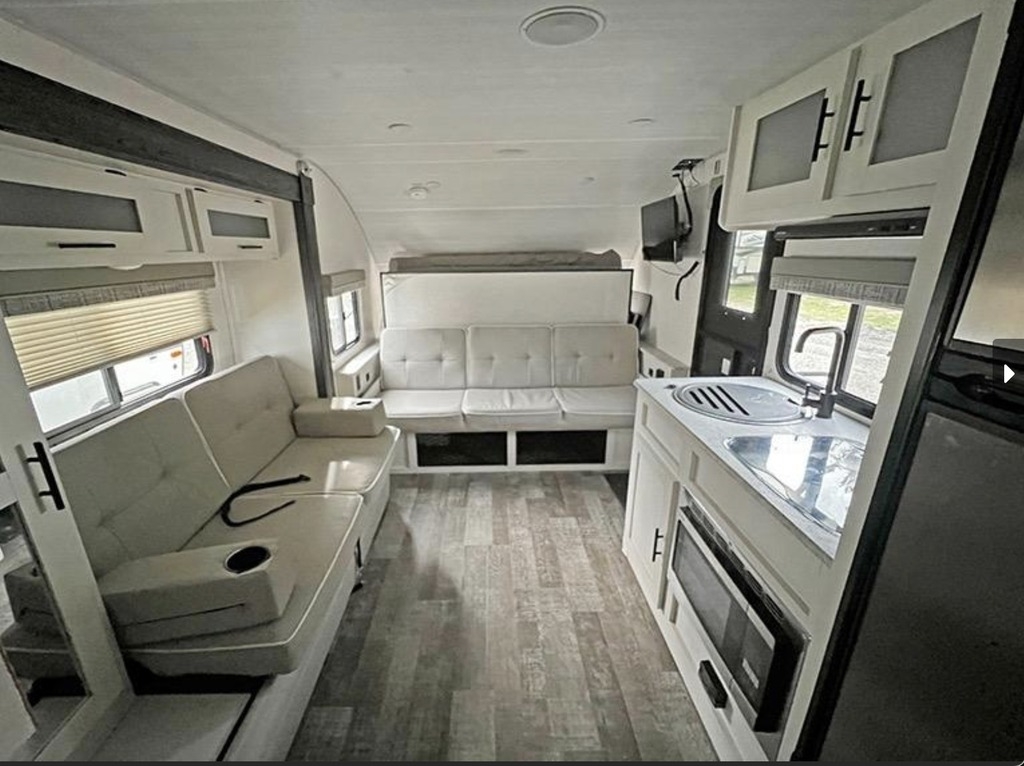 “This ultra-light travel trailer can be pulled with a small SUV. It has hardly been used and is still in excellent condition! The couches are off-white and are free from rips, tears, and stains. The A/C blows very cold to ensure comfort. Goodyear Endurance tires purchased new July 2024.”