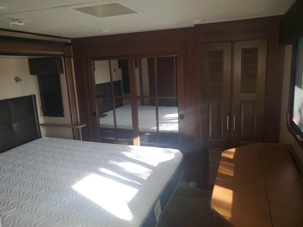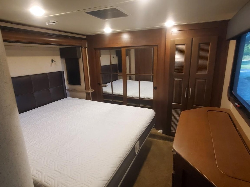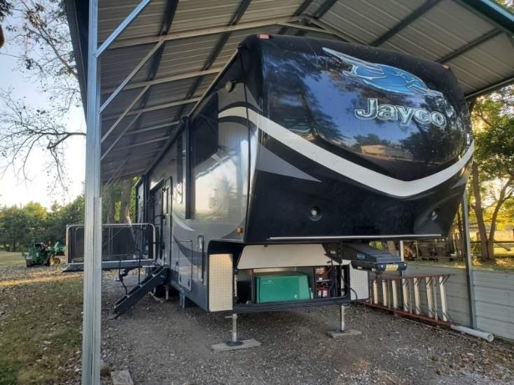 This Jayco has an overall length of 45.2 feet and comes equipped with 2 power-retractable slide-outs, a 20-foot power awning, a generator, a 12-foot garage, 1½ baths, 2 patios, a fireplace, and plenty of room to sleep 7. This unit has been well-maintained.