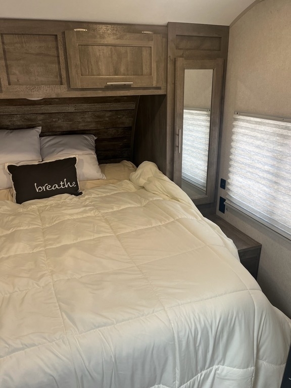 This Forest River has an overall length of 28.75 feet and comes equipped with a power retractable awning, 1 A/C unit, a fireplace, a solar panel, a 14-foot garage area, a rear patio deck, and plenty of room to sleep 6. This unit has been well-maintained.