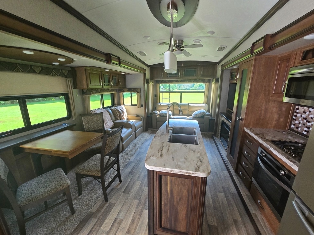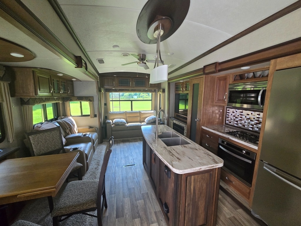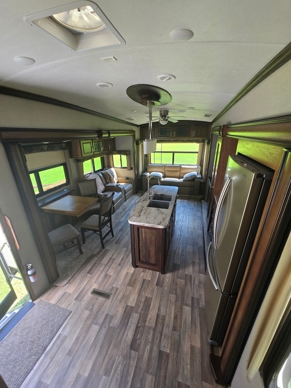 This Keystone has an overall length of 39.58ft and comes equipped with 3 slide outs, 2 awnings, 2 ac units and room to sleep 4.
