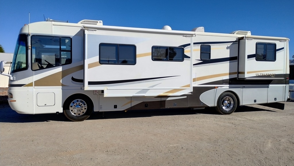 feet and it comes equipped with a 7.5kW Onan generator, 3 slide-outs, 2 awnings,
