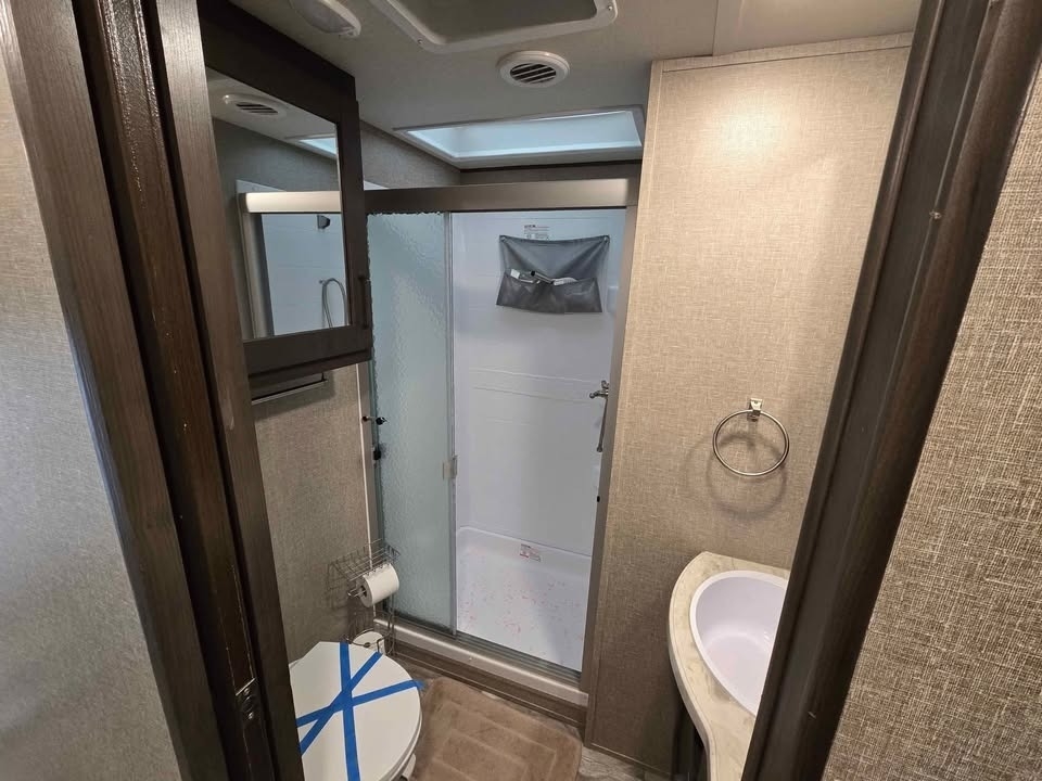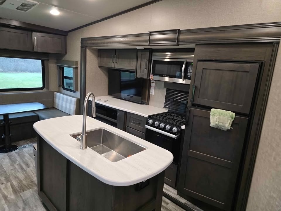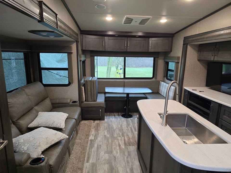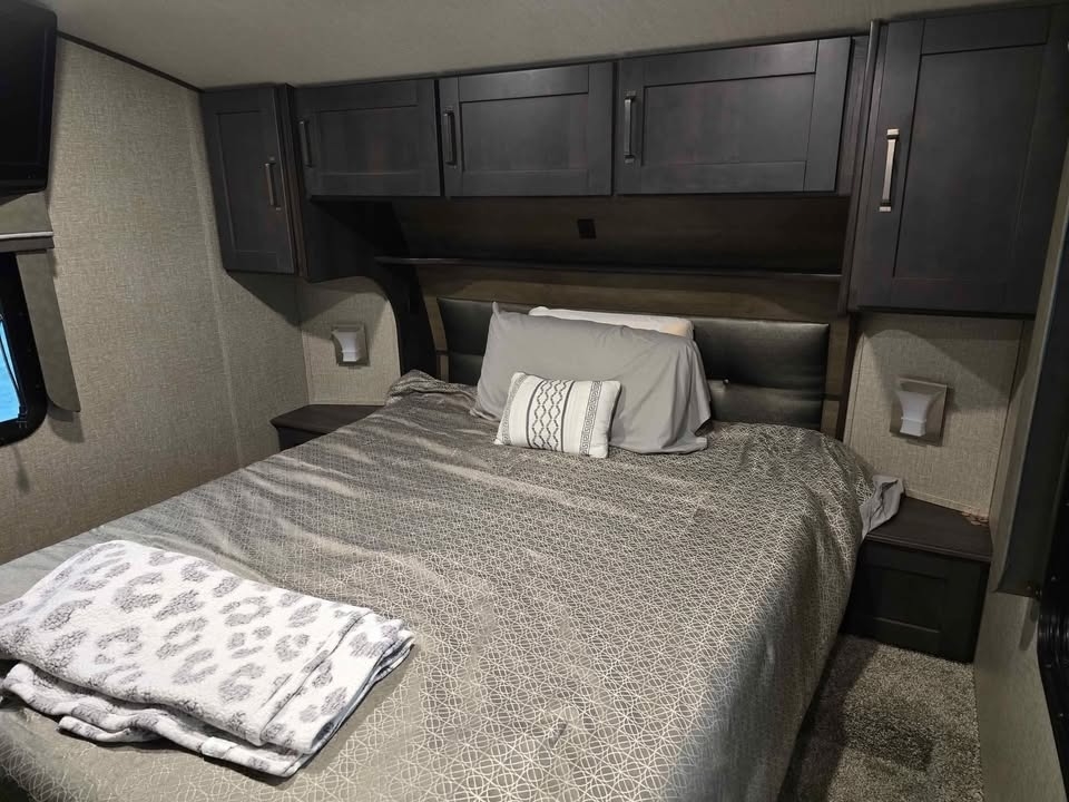 The master bedroom provides TV prep, a queen-size bed, and full-size closets for comfortable storage. Additional exterior features include Winegard WiFi 4G, on-demand hot water, extensive storage throughout, a full cover, pass-thru basement storage, freeze-proof insulation, exterior fridge, LP quick connect, TV prep, ladder, exterior shower, propane alarm, smoke and CO2 detectors, solar prep, washer/dryer prep, and backup camera prep. This Grand Design Reflection 31MB Fifth Wheel combines thoughtful design, high-end amenities, and versatile living space, making it a perfect choice for families or anyone seeking a reliable and fully equipped fifth-wheel RV.”