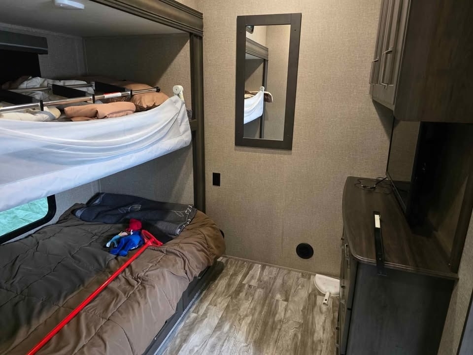 “This 2022 Grand Design Reflection 31MB Fifth Wheel offers a spacious and well-appointed layout with an overall length of 36.17 feet. It features three power retractable slide-outs, a power awning, and dual air conditioning units, providing a comfortable environment for up to six people. The unit has been carefully maintained and is ready for both weekend getaways and extended travel. The thoughtfully designed bunkhouse adds extra sleeping space and versatility, making it ideal for families or guests.
