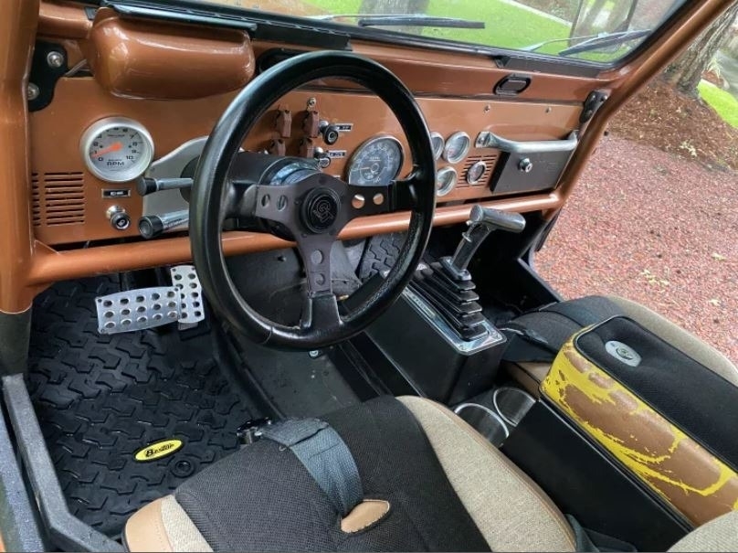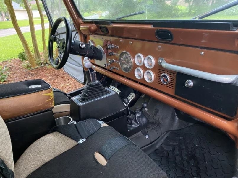 This 1980 Jeep CJ-7 Is Powered by A Chevrolet Crate Motor With 340 Hp and Paired with A 5-Speed Automatic Transmission. This CJ-7 Rock Climber Is Shown in A Dark Copper Metallic Exterior with A Black and Tan Interior. This Vehicle Has Been Garage Kept, Covered, And Non-Smoking.
