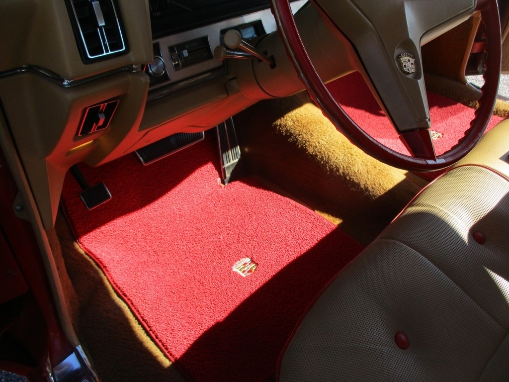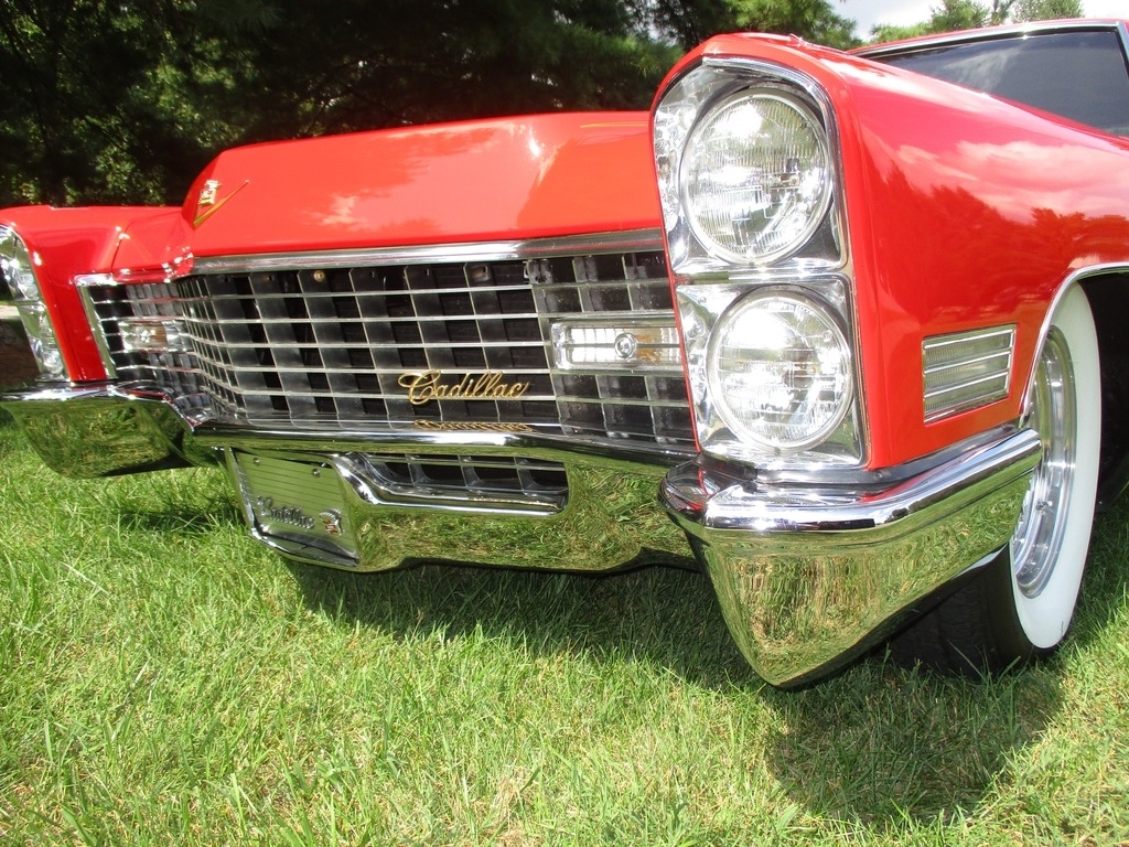 This 1967 Cadillac Deville is powered by 7.0L V8 Engine paired with a 3  Speed Turbo-Hydramatic Transmission. This Classic is Shown in Viper Red w/ Gold  Flakes, Interior Reupholstered to the Original Palimino Fabric w/ Red Seat Trim  & Steering Wheel!