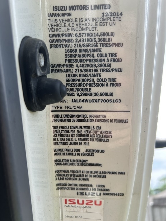“Reliable and well-maintained, this 2015 Isuzu NPR is in turn-key condition and ready to go to work. It has 150,600 miles on the dependable 4HK1TC 210 HP diesel engine, paired with an automatic transmission and a GVWR of 14,500 lbs. Cold A/C, cruise control, power windows and locks, and an AM/FM/CD radio make for a comfortable ride. The original seats are in superb condition and have been protected with covers. This truck features a 16’ Morgan box with a roll-up door, three interior LED light strips, a Maxon 2,000 lb. liftgate with new hydraulic cylinder seals (2024), and a cab-mounted wind deflector. It rides on six new BFG LT215/85R16 commercial tires (installed July 2024) and includes two spare wheels and tires. Recent service includes a new DEF fluid pump (Oct 2024), new #2 O2 sensor (May 2025), box floor sections replaced as needed (May 2025), and two new batteries (Jan 2026). Engine oil and filters have been changed every 6,500 miles, with regular tire rotations and full maintenance performed per Isuzu's recommended intervals, including fuel filter, transmission fluid, differential oil, and power steering fluid. Perfect for delivery, moving, or business needs—this truck is ready to hit the road and get the job done.”
