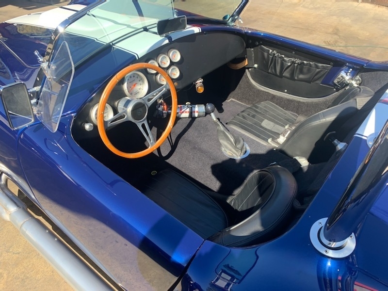 This Factory Five Convertible is Powered by a 408Cu Engine Paired with a 5 Speed World Class Tremec with 5,600 Miles on the build. This Convertible is Shown with a Blue exterior and Black Interior.