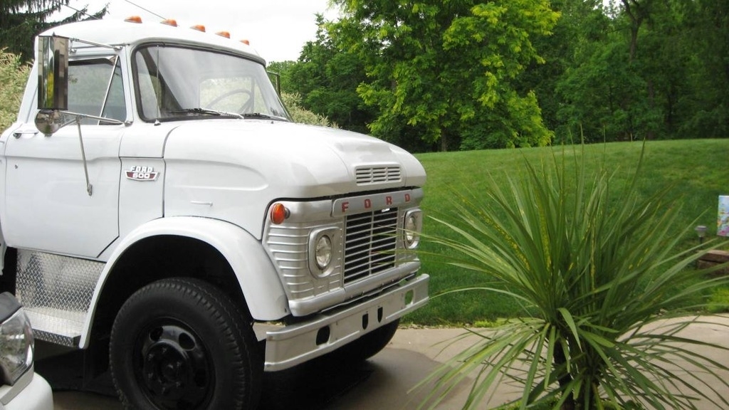 This 1967 Ford N-Series Truck is powered by a 280 HP 332 V8 gasoline engine paired with a 5-speed manual transmission with 2-speed rear end. This Ford N-Series is shown with a white exterior and a white and red interior.