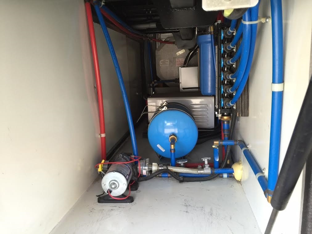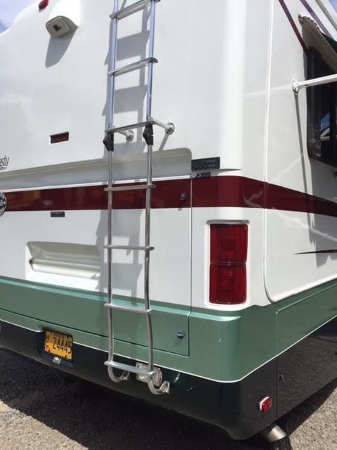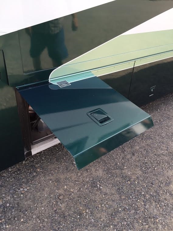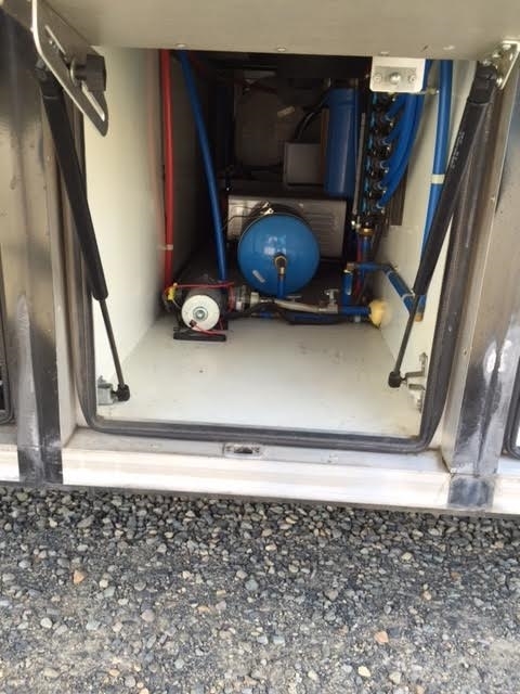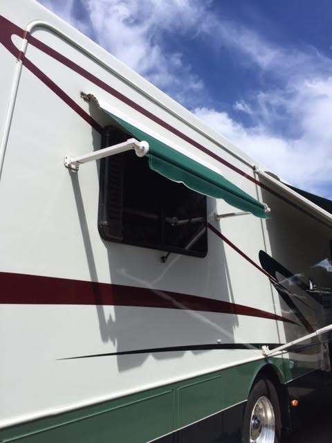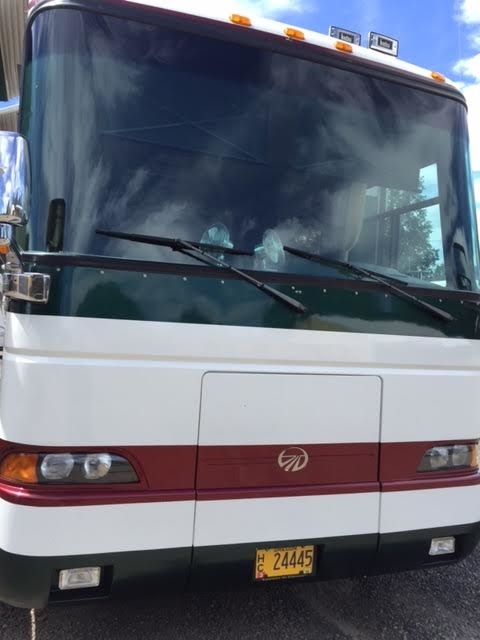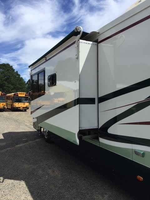 EXTERIOR: Basement Storage, Furnace, Heat Pump, Power Boost Antenna, Back up Camera, Power Mirrors, Tow package/Hitch, Onan 75 Generator Included, 2 Solar Panels on top (2 1/2 by 5 foot), New Straps for all 5 awnings, 350 horsepower Cummings diesel pusher engine, hydraulic leveling jacks, etc.