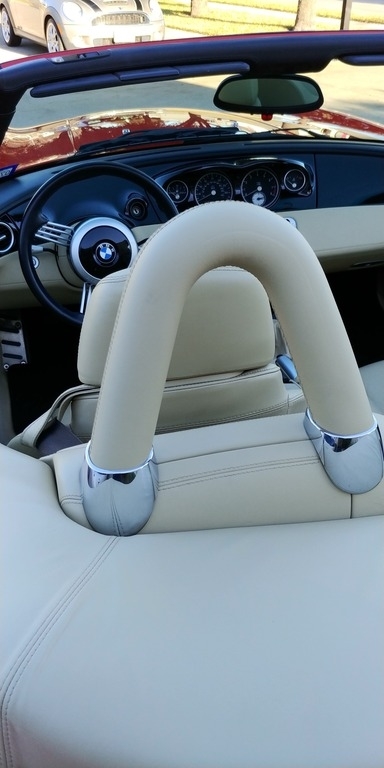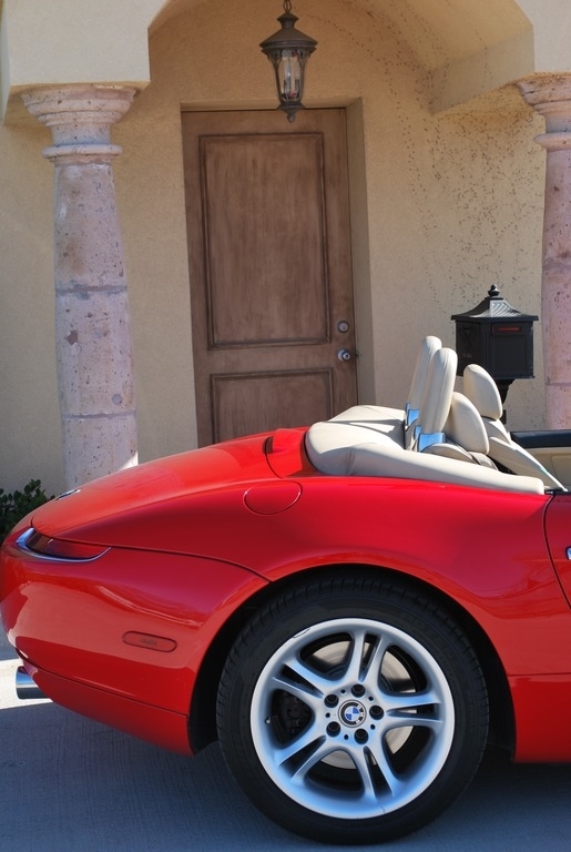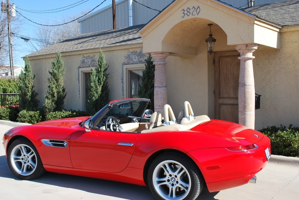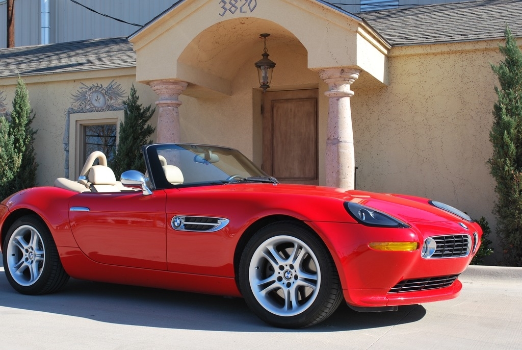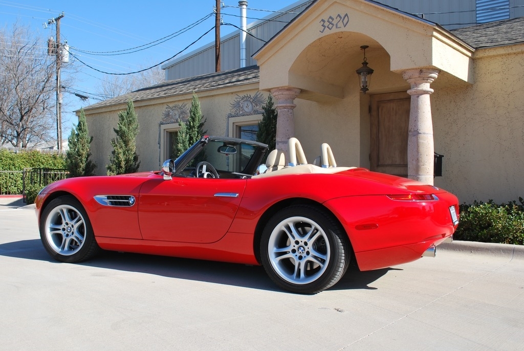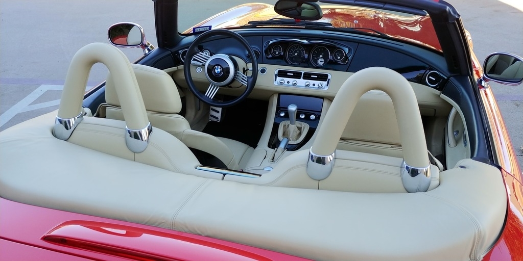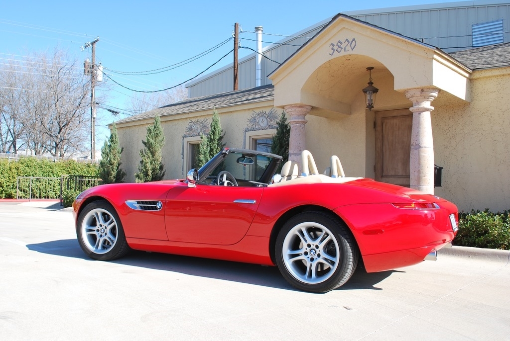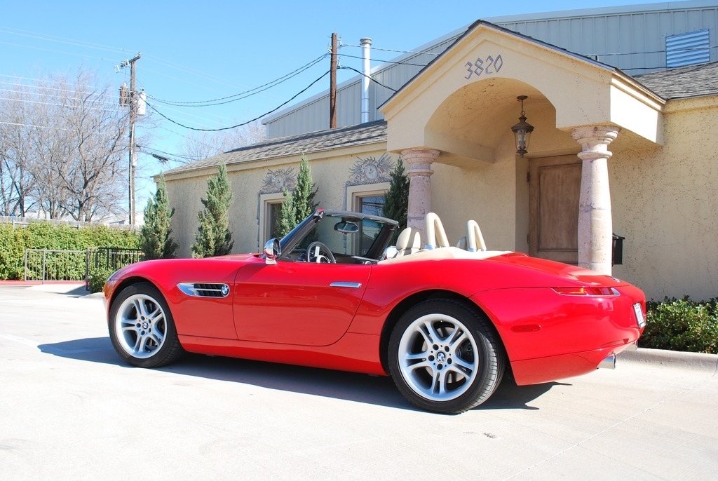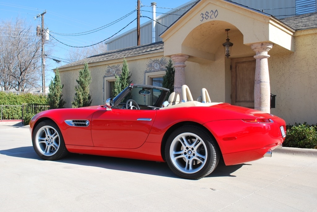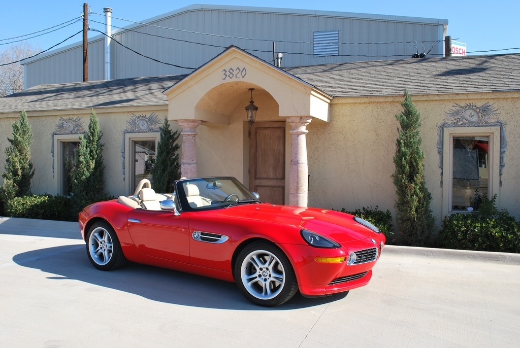 This 2002 BMW Z8 Convertible is shown in a Red exterior with Crema interior and a Tan Soft Top. It is powered by a 5L 8-Cylinder engine and paired with a 6-Speed Manual transmission. This is a non-smoking vehicle that has had no pets inside and has always been garage kept.