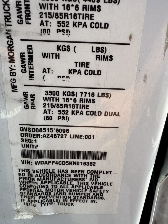 Year/Make/Model:  2019 Mercedes-Benz Box Truck