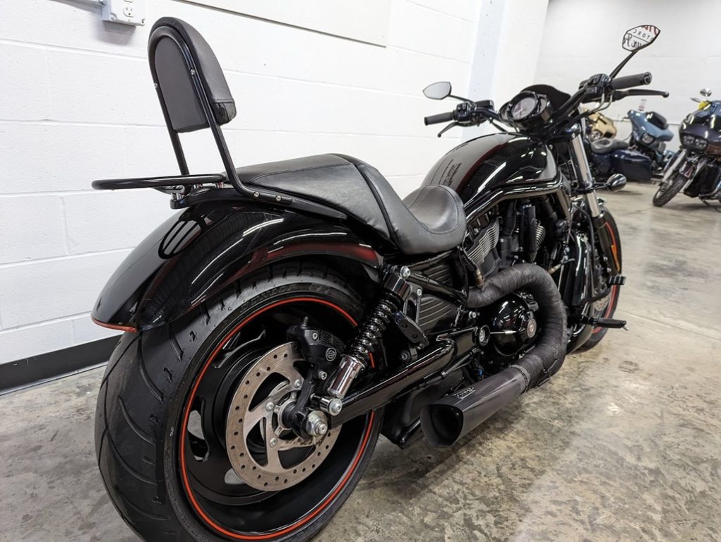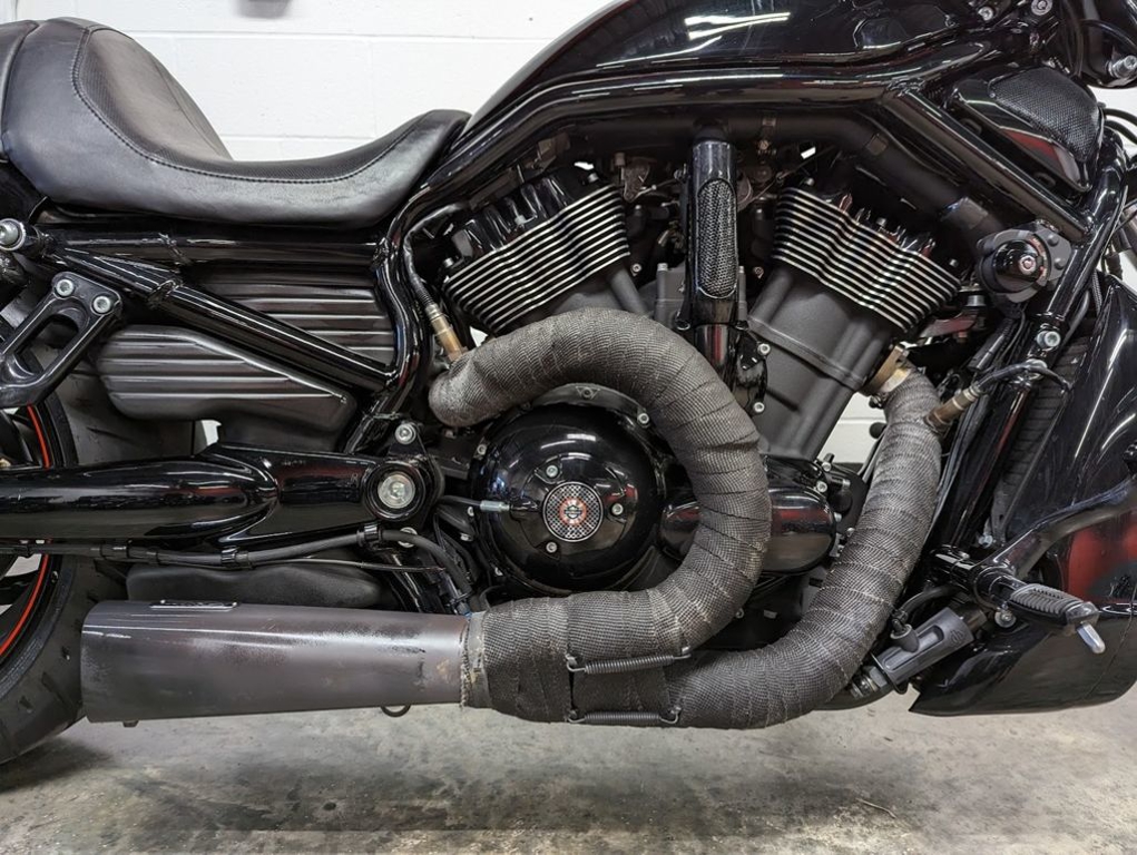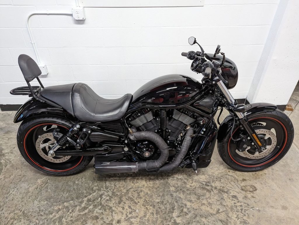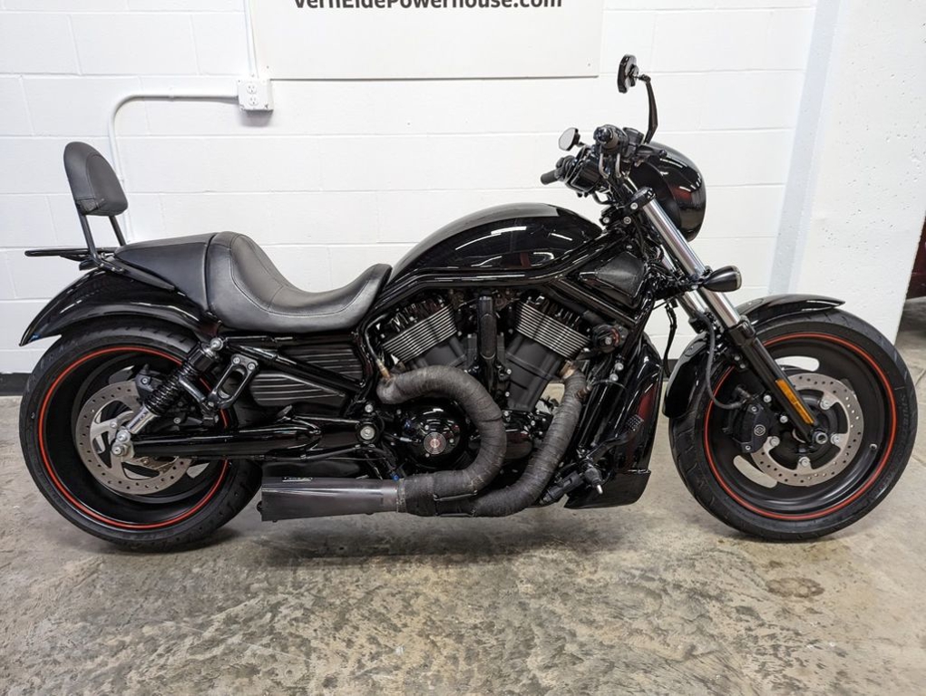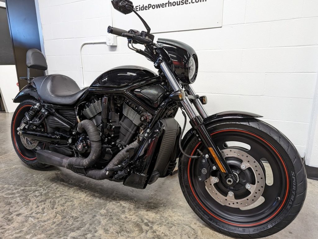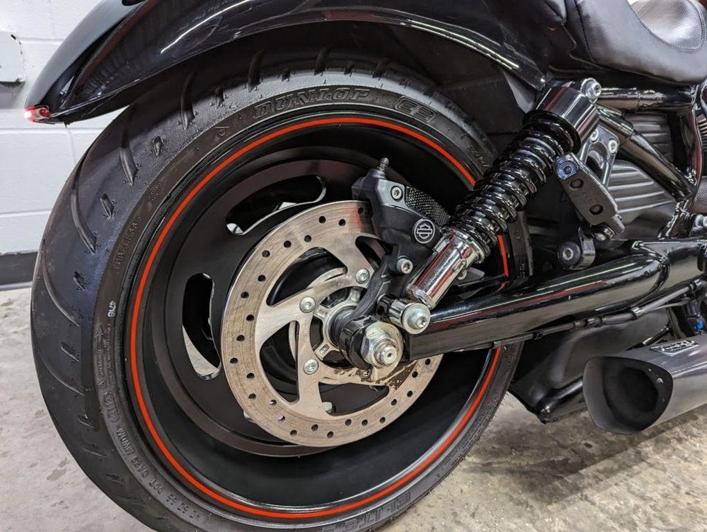 An all-black Revolution V-Twin™ engine, fork legs, swing arm and other blacked-out components give the VRSCDX Night Rod® Special a raw, street-tough attitude. A nacelle surrounds a round reflector-optic headlight. The brushed aluminum Straight-shot Dual mufflers have black end caps and exhaust shields. Drag bars and forward foot controls put the rider in a stretched-out posture. A contrasting racing stripe paint scheme traces the length of the bike. Black Slotted cast aluminum wheels have a fine orange stripe on the rim. A seat height of just 25.2-inches is the lowest or any VRSC model. Available in Black Denim with a Vivid Black stripe, in Vivid Black with a Pewter Pearl stripe, or in Vivid Black with a Mirage Orange Pearl stripe.