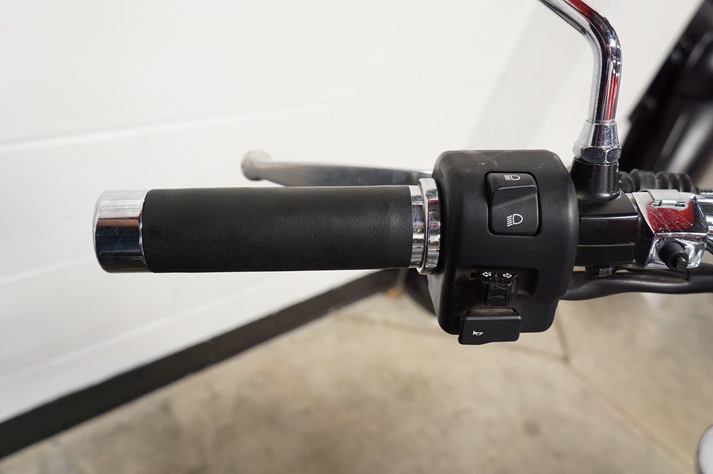 The newly designed large-diameter meter is mounted on the fuel tank for a traditional look. Meter functions include speedometer, fuel level warning light, oil level warning light, and odometer with two trip meter functions, fuel trip meter, and clock display. The LCD display illumination can be adjusted using a right side handlebar switch.