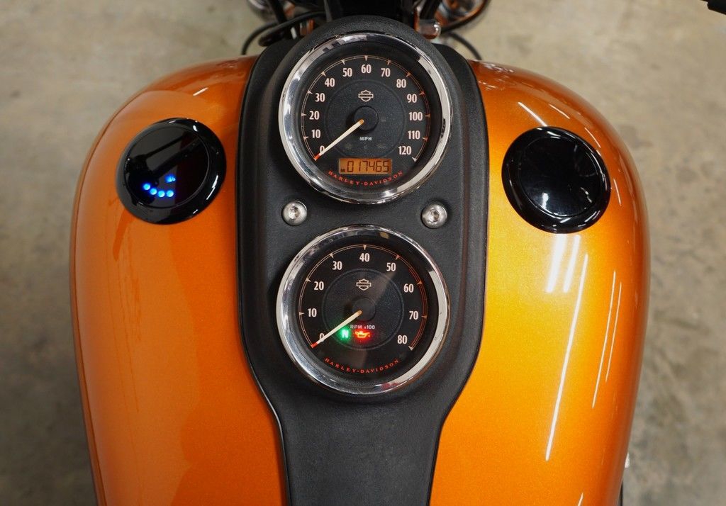 There’s a new wrinkle black console with a speedo and tach mounted on the Low Rider® motorcycle’s classic Fat Bob® tank. The look ties in with the wrinkle black paint on the powertrain and fender strut covers. And gives a nice, subtle contrast to the Vivid Black paint on the tank. Because there’s no such thing as too many shades of black.