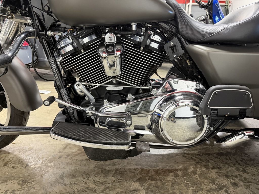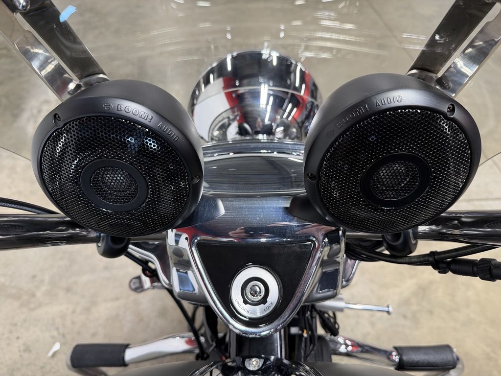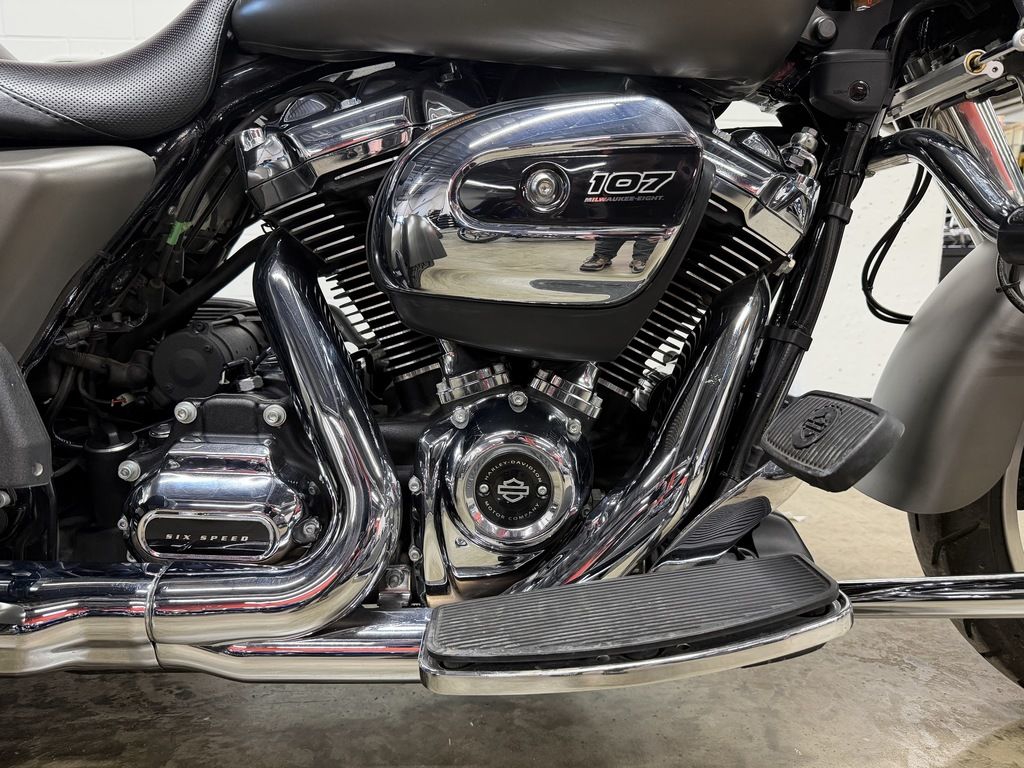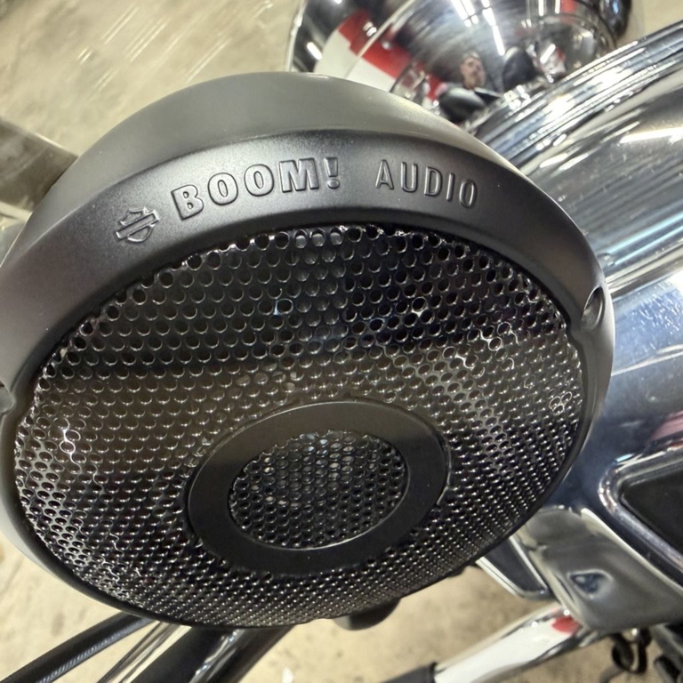 The Milwaukee-Eight® 107 engine puts its exhaust note out to the world through these chrome slash down style pipes.