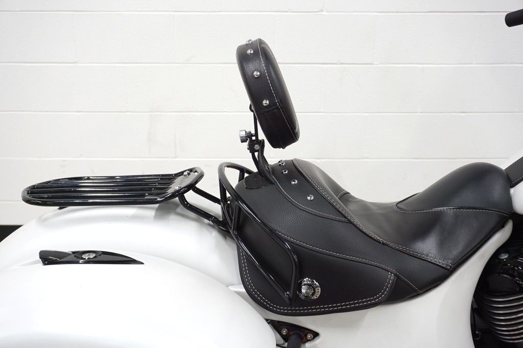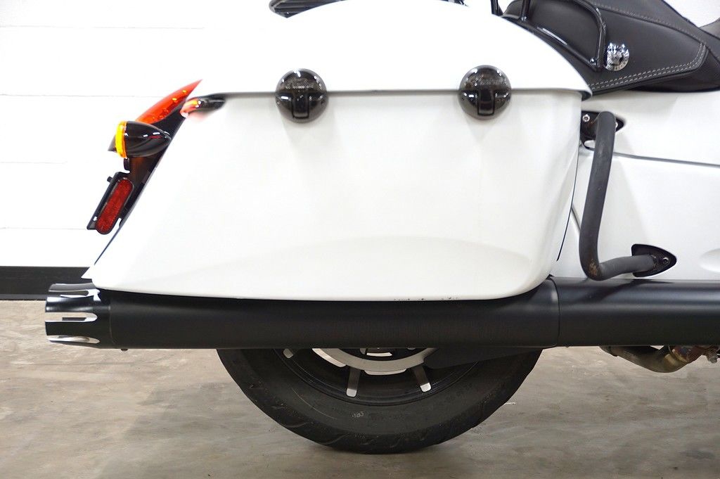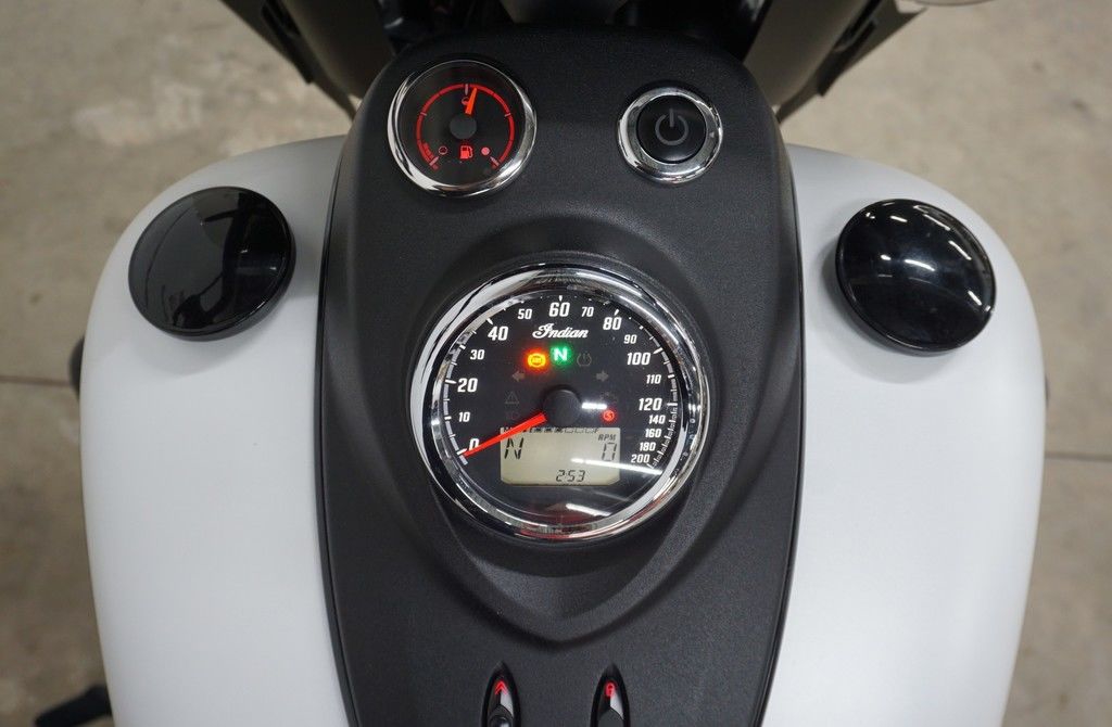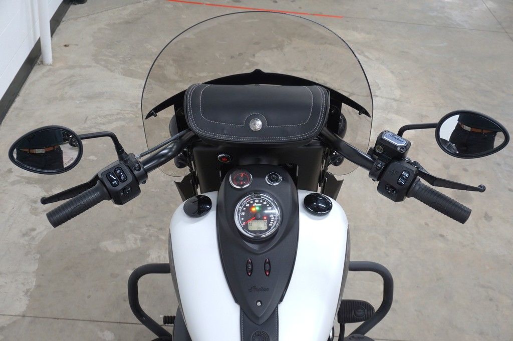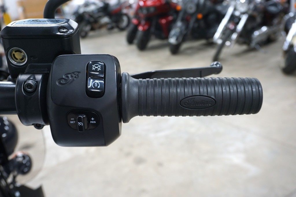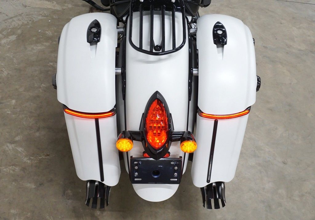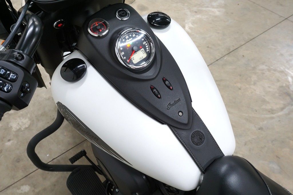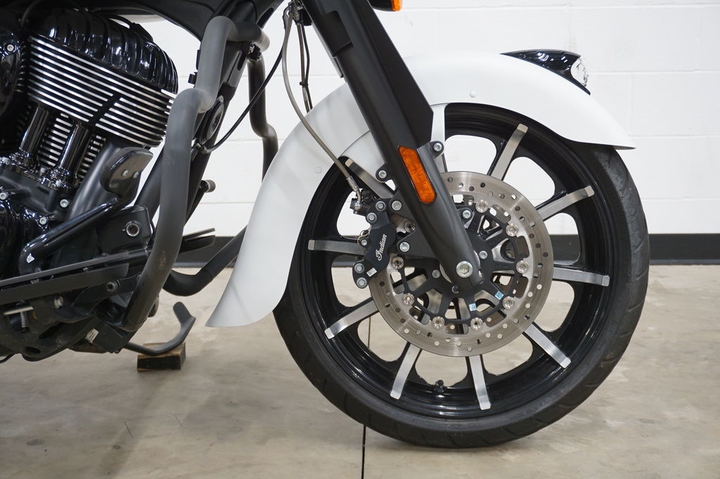 An open front fender exposes a 19” 10-spoke contrast-cut front wheel with the iconic Indian headdress leading the way.