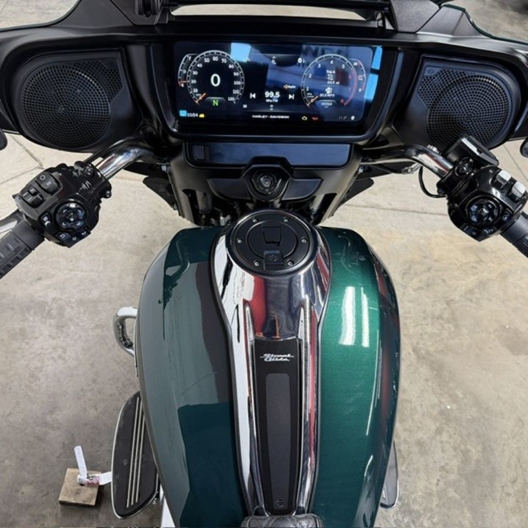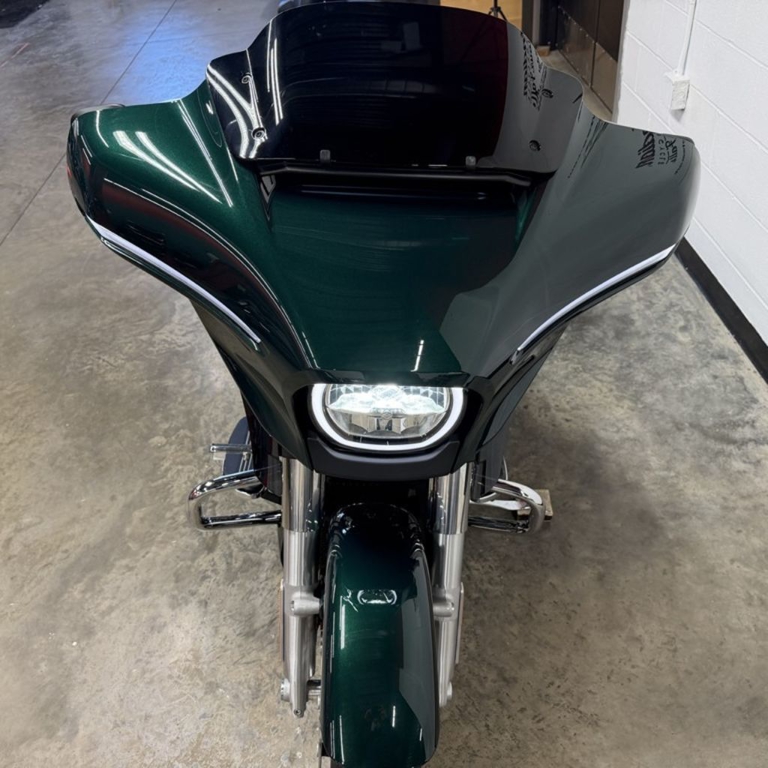 The iconic batwing fairing takes on new life with a sculpted silhouette, fully integrated LED lighting, and a split-stream vent opening. Using computational fluid dynamics (CFD), the Street Glide fairing has been designed to optimize aerodynamic efficiency and enhance rider comfort.