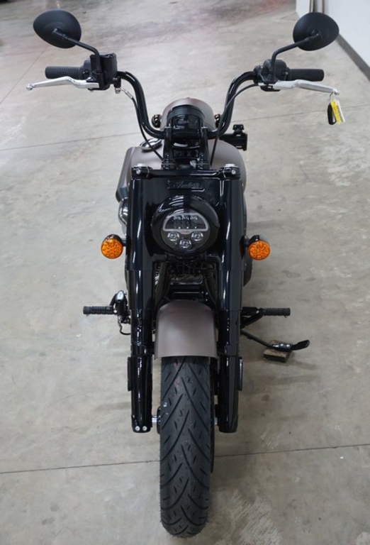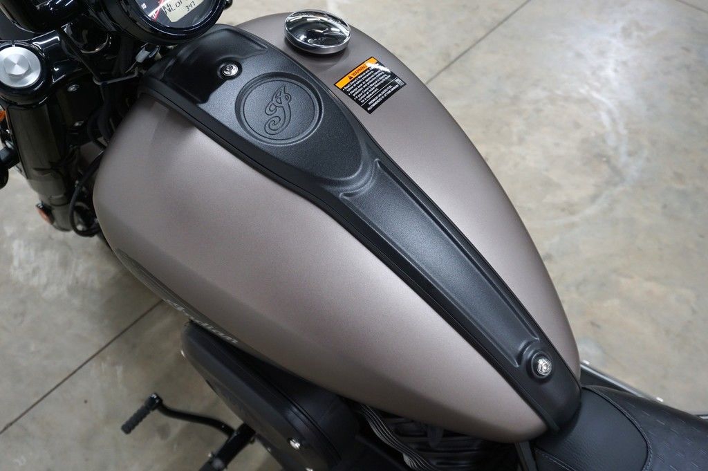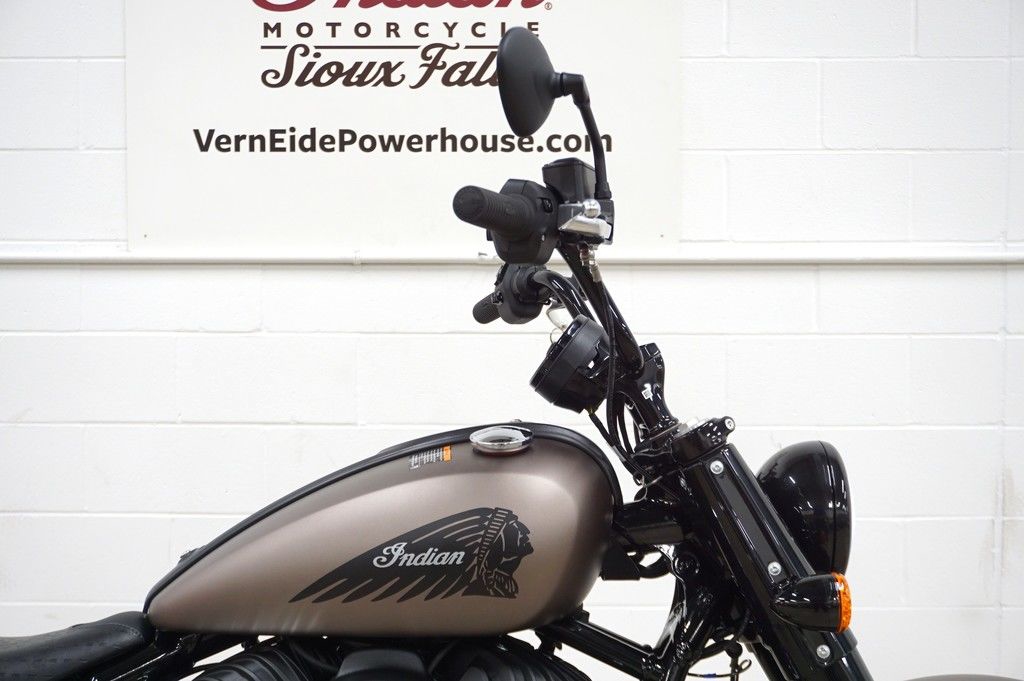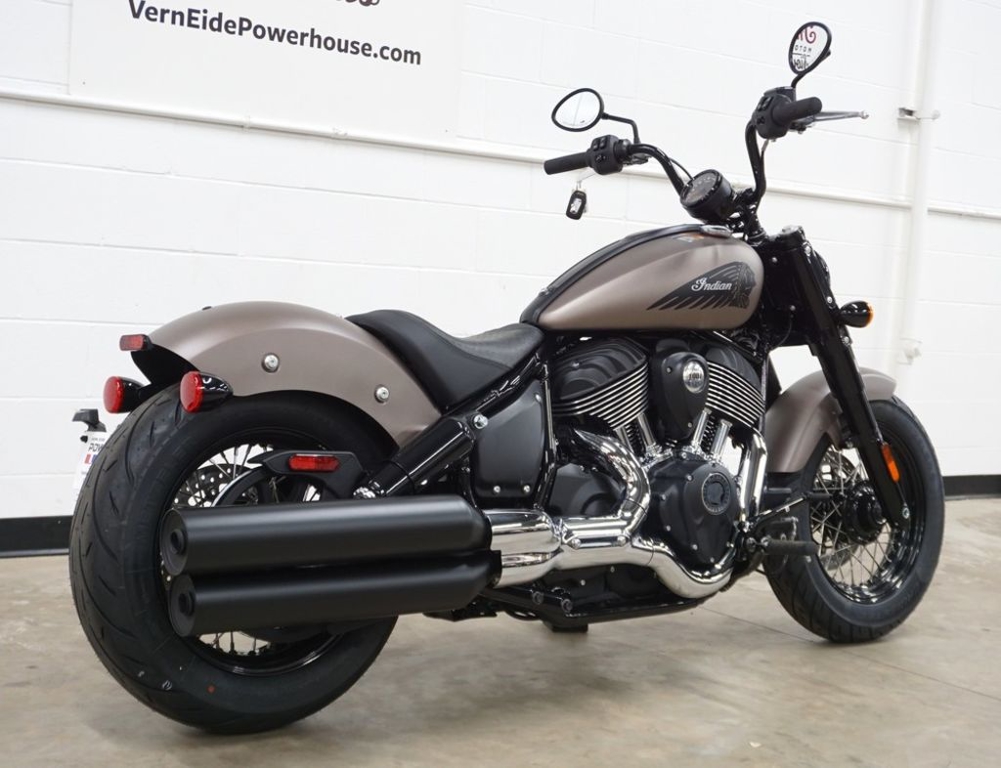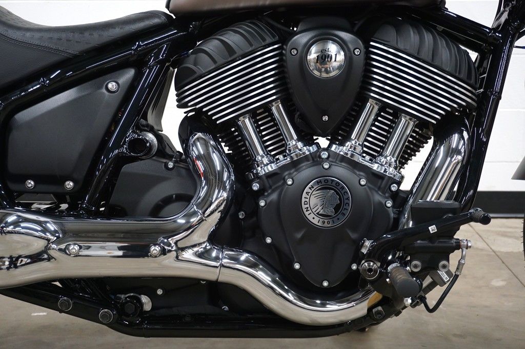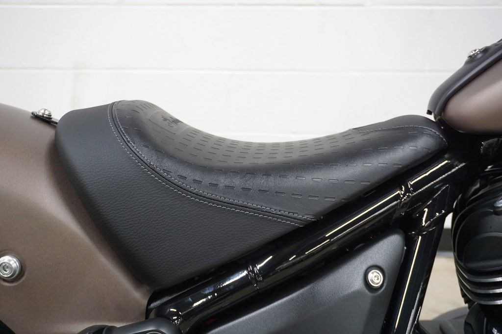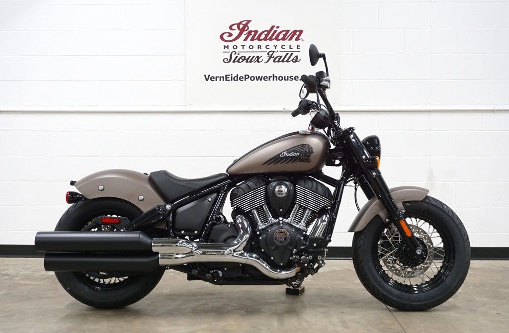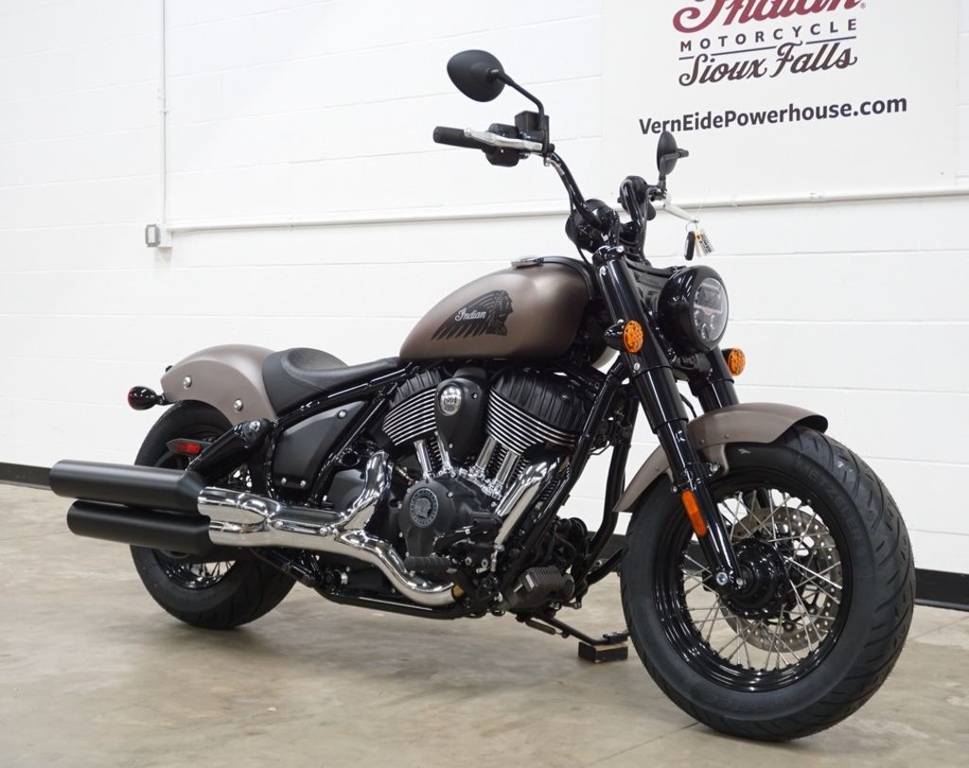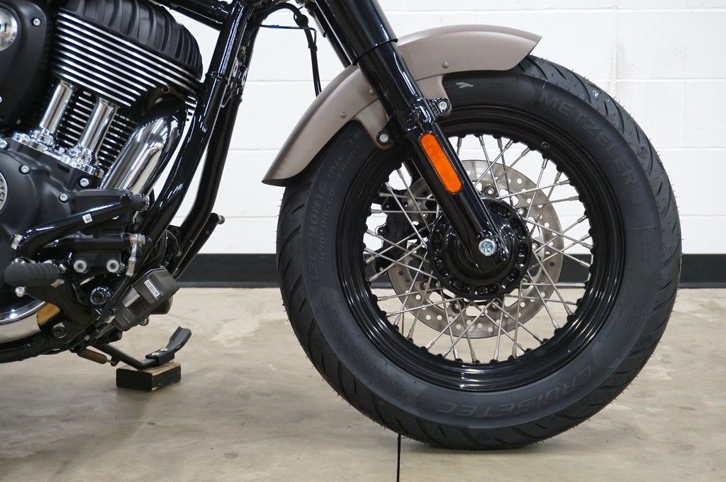 A welded steel tube frame, chopped fenders, large headlight bucket with nacelle, and covered forks and rear shocks give the Chief Bobber a nod to traditional bobber style.