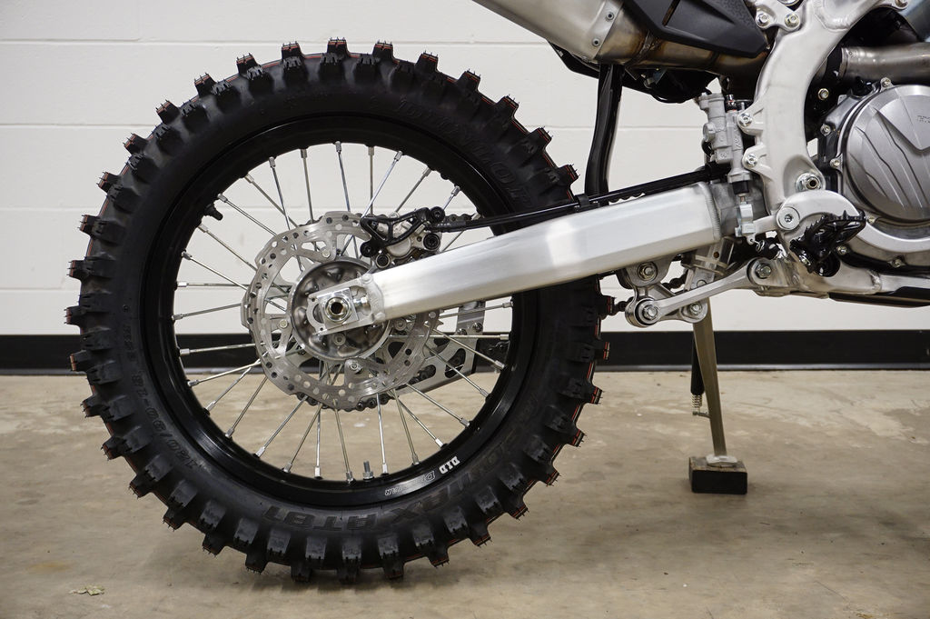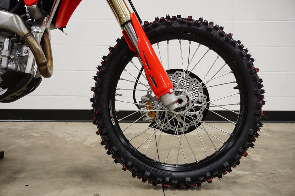 PERFORMANCEThe CRF450RX’s Dunlop Geomax tires are specially designed for Enduro use. The AT81 tires are spec’d at 21 inches for the front and 18 inches for the rear. You read that right: the CRF450RX rolls on an 18-inch rear wheel.