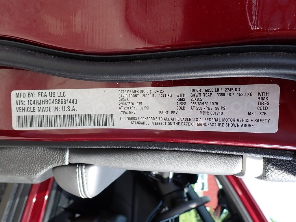 Velvet Red Pearlcoat 2025 Jeep Grand Cherokee Limited 4WD 8-Speed Automatic 3.6L V6 24V VVT 4WD, Black Appearance Package, Gloss Black Exterior Accents, Navigation System, Quick Order Package 23E (DISC), Wheels: 20" x 8.5" Gloss Black Painted Aluminum.