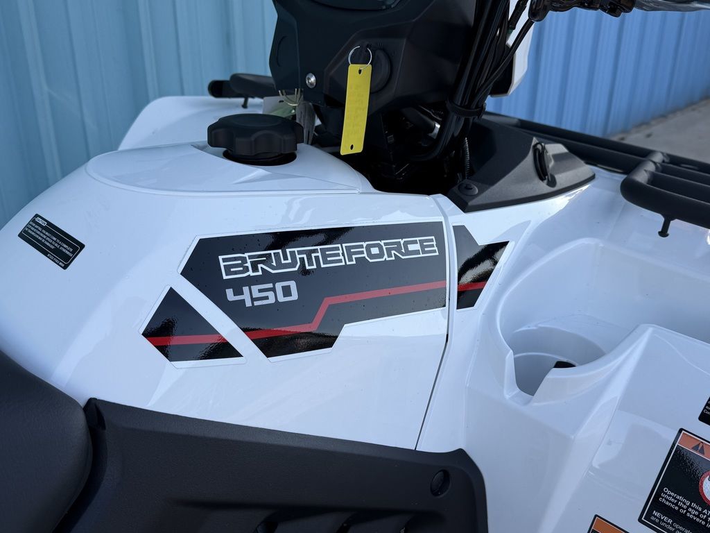 Energize work and play on the all-new Brute Force® 450 4x4 ATV. Combining power and agility this mid-size ATV is equipped with a liquid-cooled 4-stroke 443cc engine, smooth CVT transmission, and a 2WD/4WD plus front differential lock system that is built to tackle demanding tasks while boasting unique sporty performance.