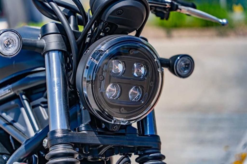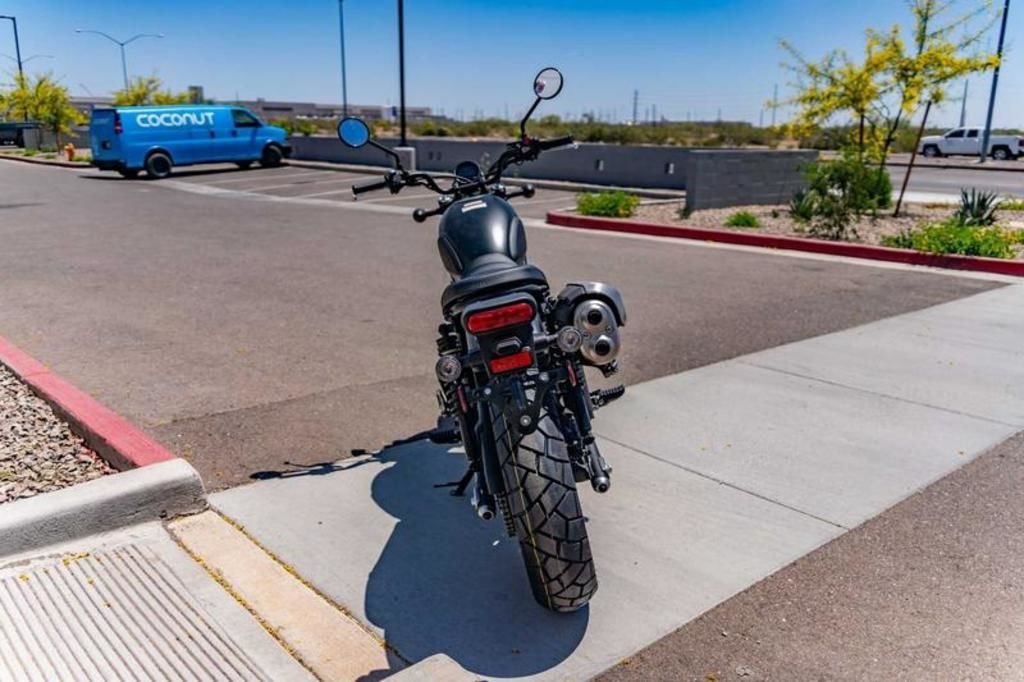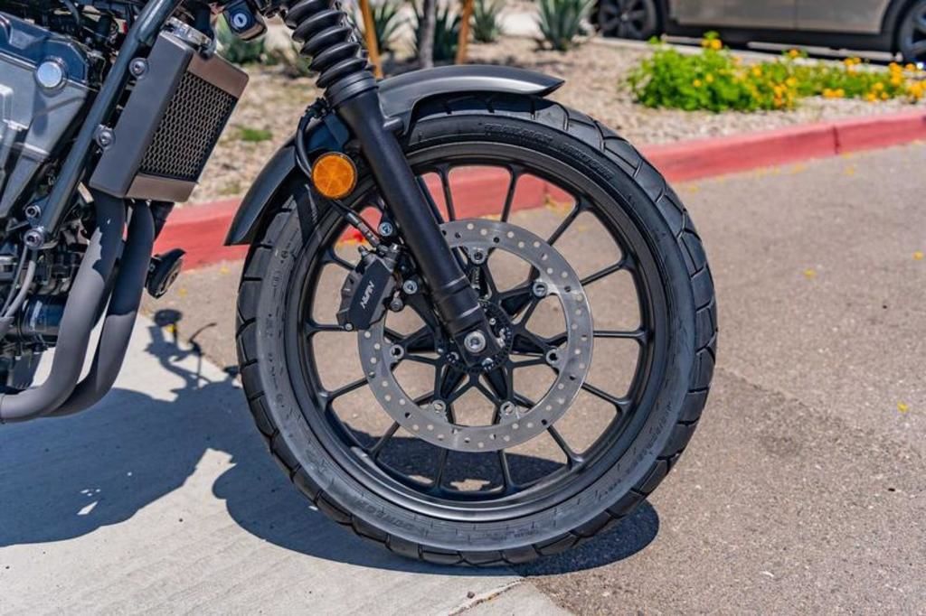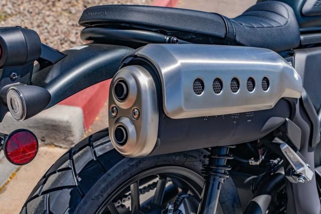 This bike gets the scrambler-style look just right: high-mount muffler, 19-inch front and 17-inch rear wheels with wide rims, and a blacked-out engine and frame.