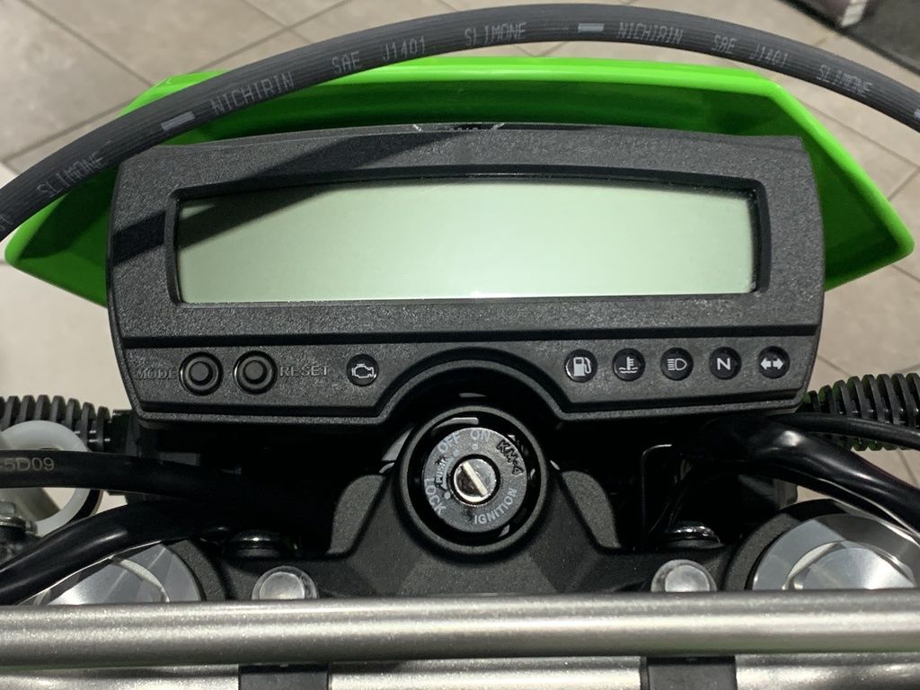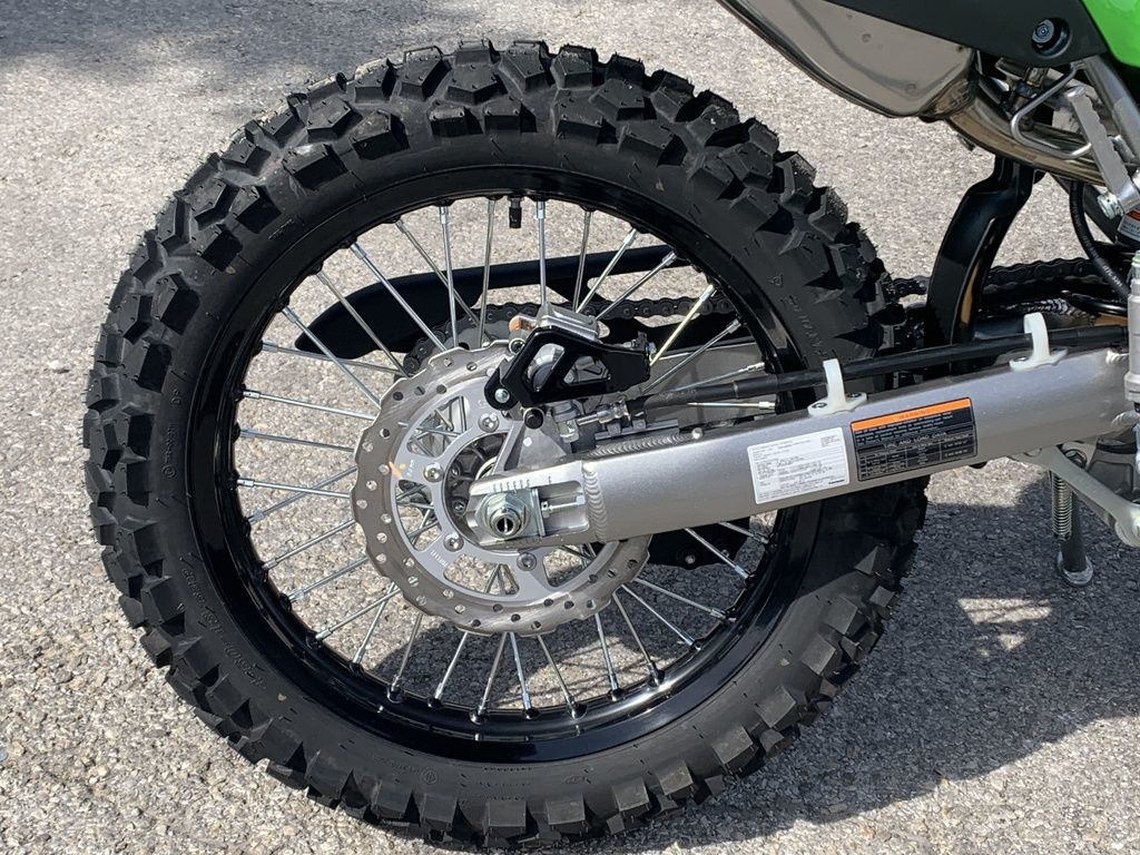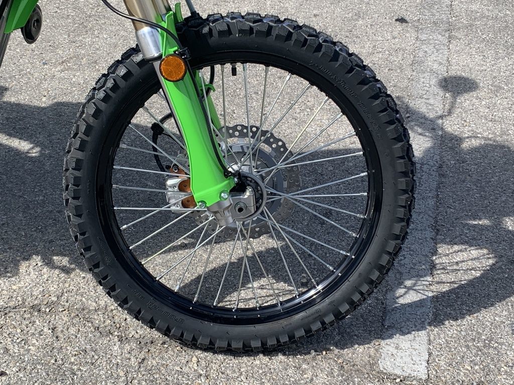 DUAL-SPORT CAPABILITYThe KLX®300 highly versatile motorcycle exhibits agile maneuverability whether on- or off-road thanks to a slim, lightweight perimeter frame. The caster angle (26.7°) and short wheelbase contribute to quick handling, while the high rigidity of the frame ensures straight-line stability. Long-travel suspension is trail-tuned and offers 10 in of travel up front and 9.1 in in the rear. The 43mm inverted cartridge-style front fork has adjustable compression damping to optimize fork performance for conditions and personal preference. The Uni-Trak® rear suspension offers bump absorption, compression and rebound damping adjustability, and fully adjustable preload, allowing riders to tailor shock settings to personal preference. Substantial braking power comes from a powerful 250mm petal disc and twin-piston caliper up front and a 240mm petal disc and single-piston caliper in the rear. Strong dual-sport performance is further enabled with a 21-in front wheel and 18-in rear wheel. Wheel rigidity contributes to light, smooth handling and offers great durability for off-road riding.