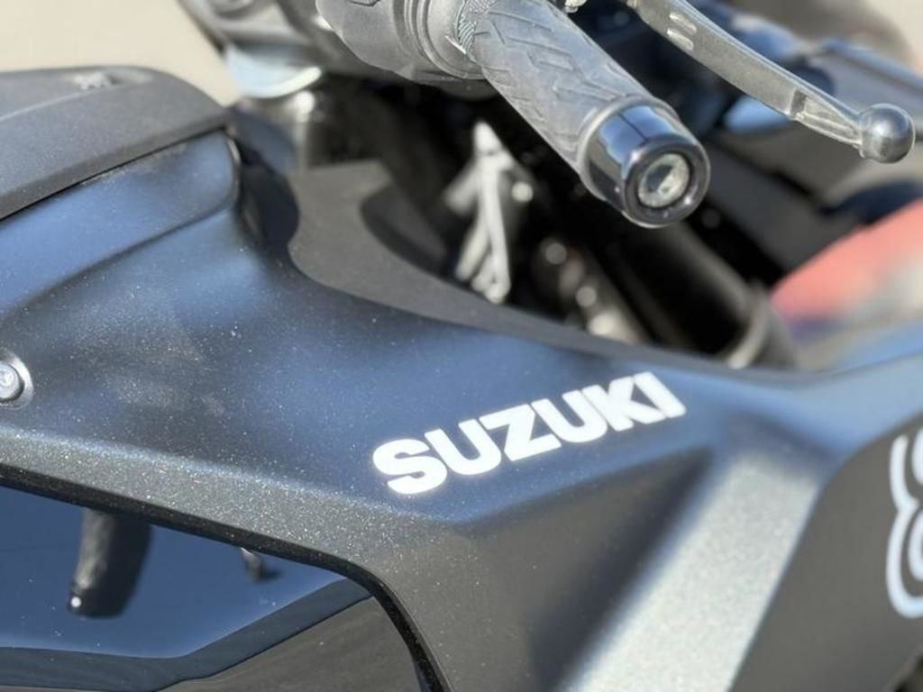 • The GSX-8T has a distinctive short muffler design with a brushed heat shield so it looks as good as it sounds. Most of the exhaust system is located under the chassis in an optimal, centralized location that also benefits