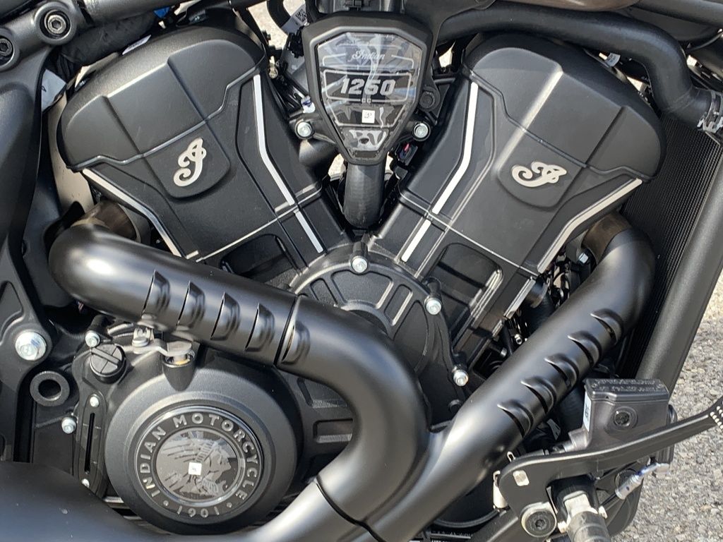 The contour lines on the rear fender seamlessly connect with the modern and dynamic Scout gas tank, creating a unified and premium blacked out aesthetic.