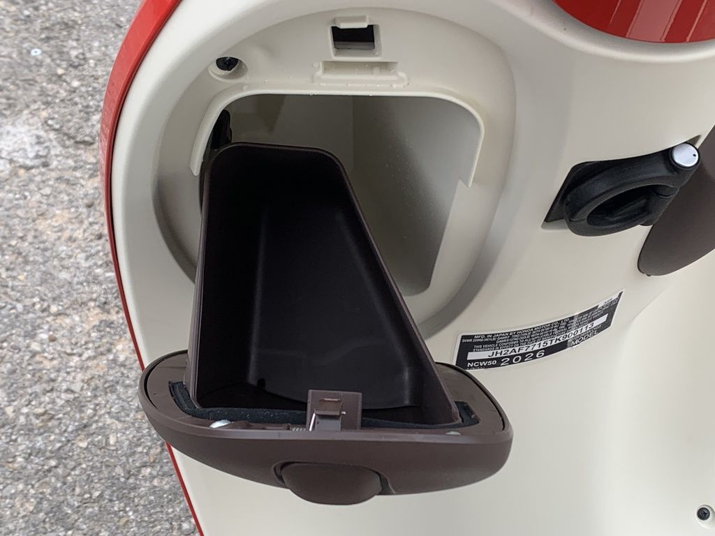 This scooter has a spacious weather-resistant underseat storage area that can accommodate a helmet, books, or groceries. A lock secures the storage area for added security.