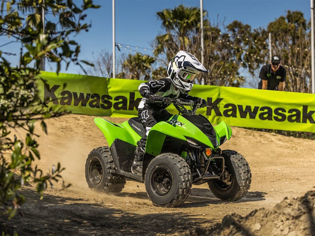 Four-wheel fun starts with KFX®. Get the kids outdoors and ready to ride on the KFX®90 ATV line with proportionate power and size for riders ages 10 and older. KFX90 ATVs let kids take on more challenging tracks and bigger adventures with an 89.9cc engine and sporty suspension.