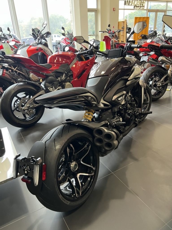 The fully adjustable suspension on the XDiavel V4 consists of a 50 mm USD fork (with adjustment of the compression and preload on the left stanchion and rebound on the right stanchion) and a shock with separate reservoir. Wheel travel is 4.7 in at the front and 5.7 in mm at the rear, 0.9 in more than the XDiavel 1260 for increased rider and passenger comfort.