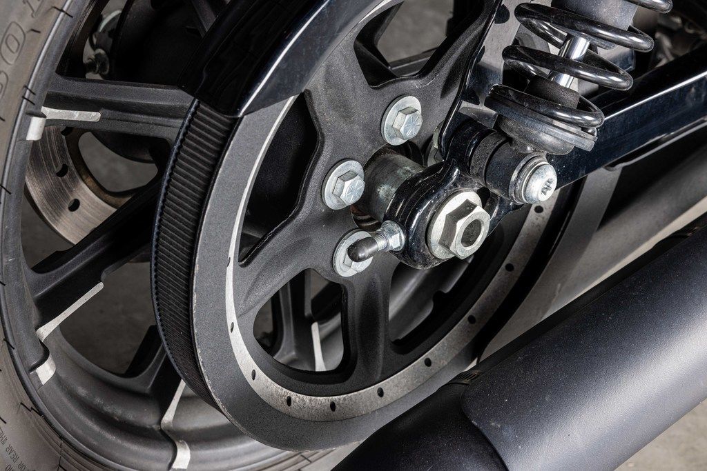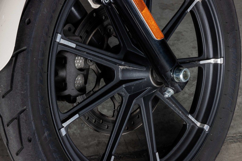 Blacked out nine-spoke wheels set off by a contemporary mechanical look machined into the spokes.