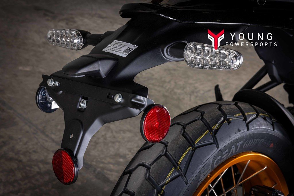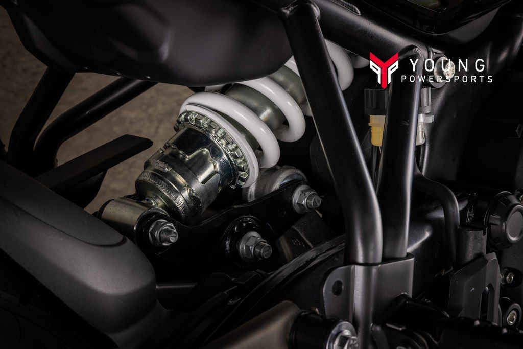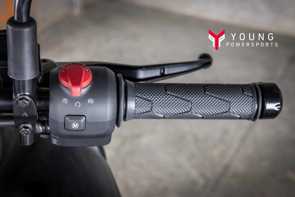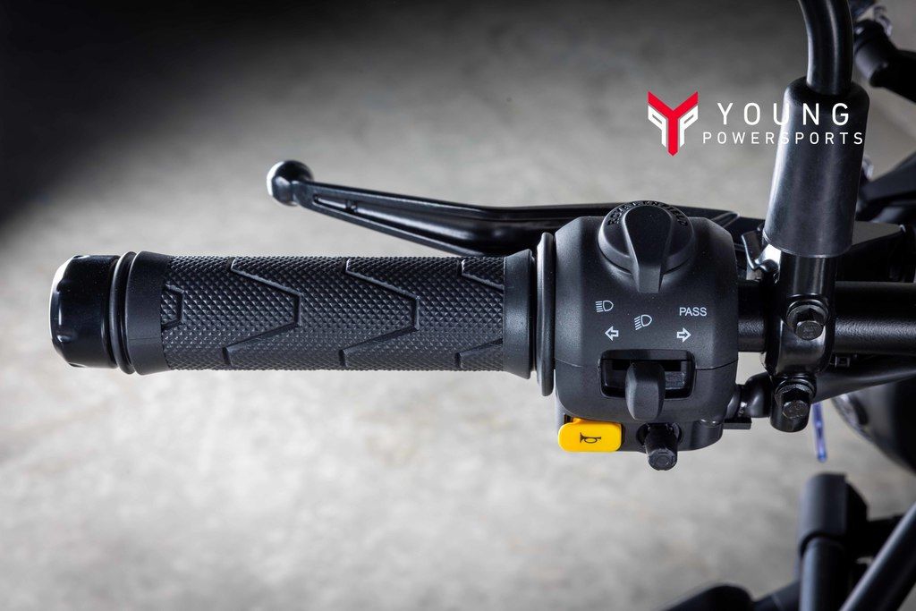 The steel twin-spar frame is stronger, stiffer and narrower between the legs for improved comfort while riding in a standing position. Better handling, better stability and better balance.