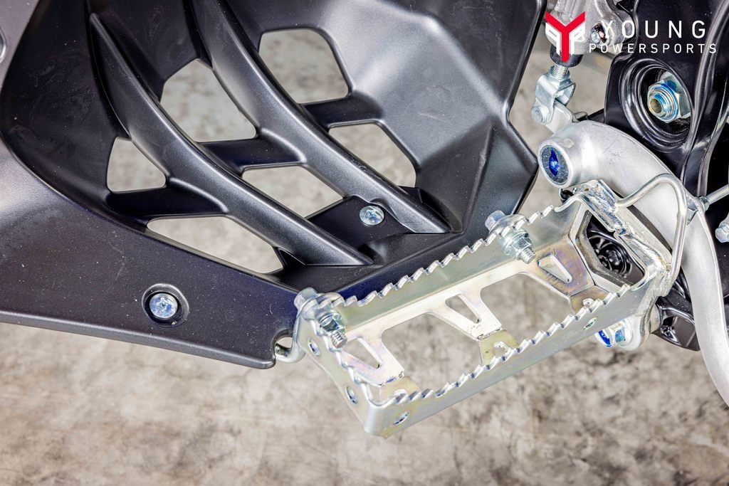With more room to hang off in the corners, the bodywork is designed for great ergonomics and rider comfort. The seat shape is padded in just the right places while the body panels come off easily without tools for service, so there's no need to remove the battery or other components to take the fenders off.
