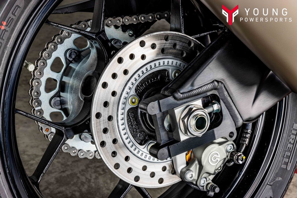 Developed jointly with Akrapovic, the muffler is made out of titanium for light weight and improved mass centralization, while a special valve helps boost torque at lower revs and increase horsepower at higher rpm.