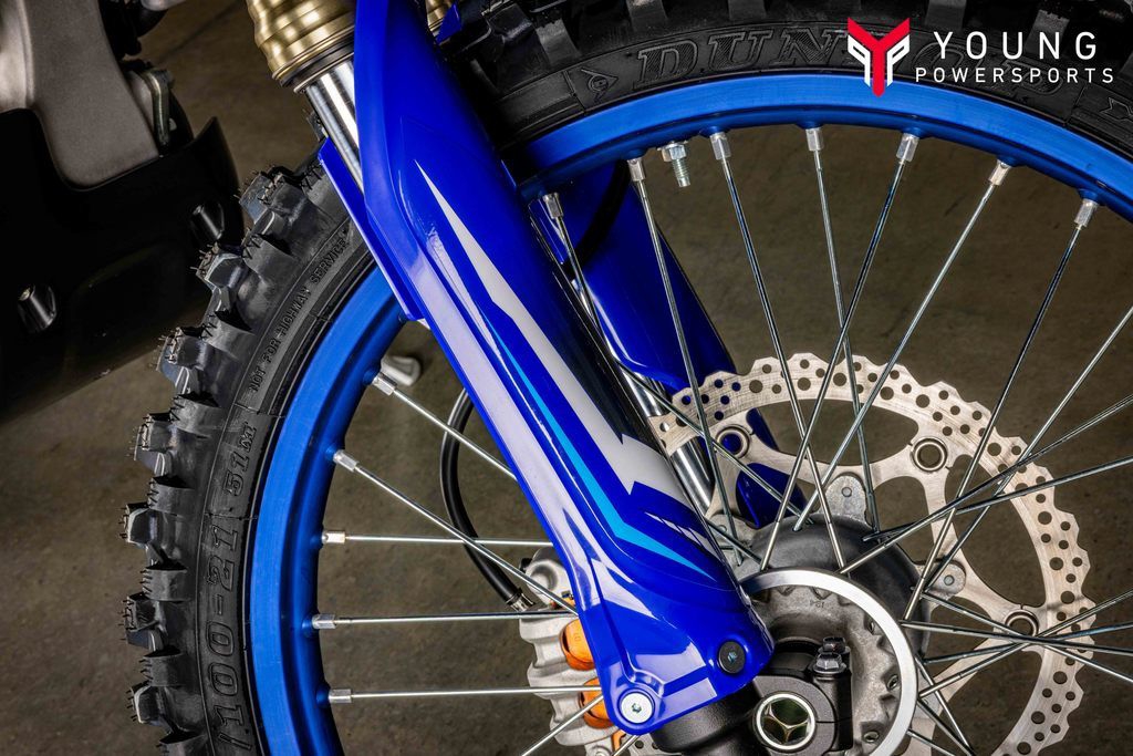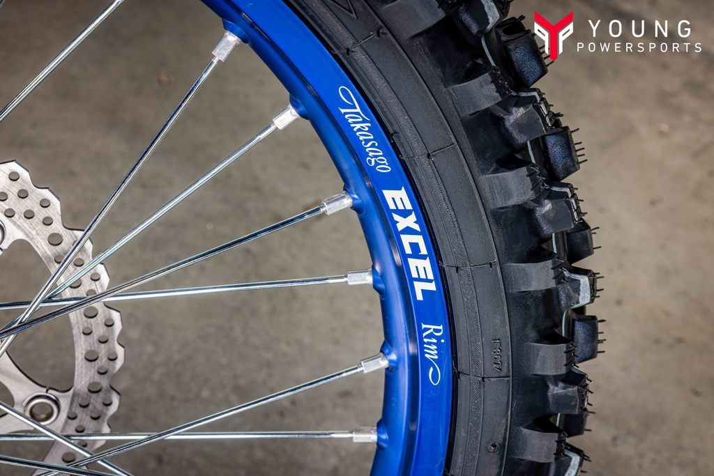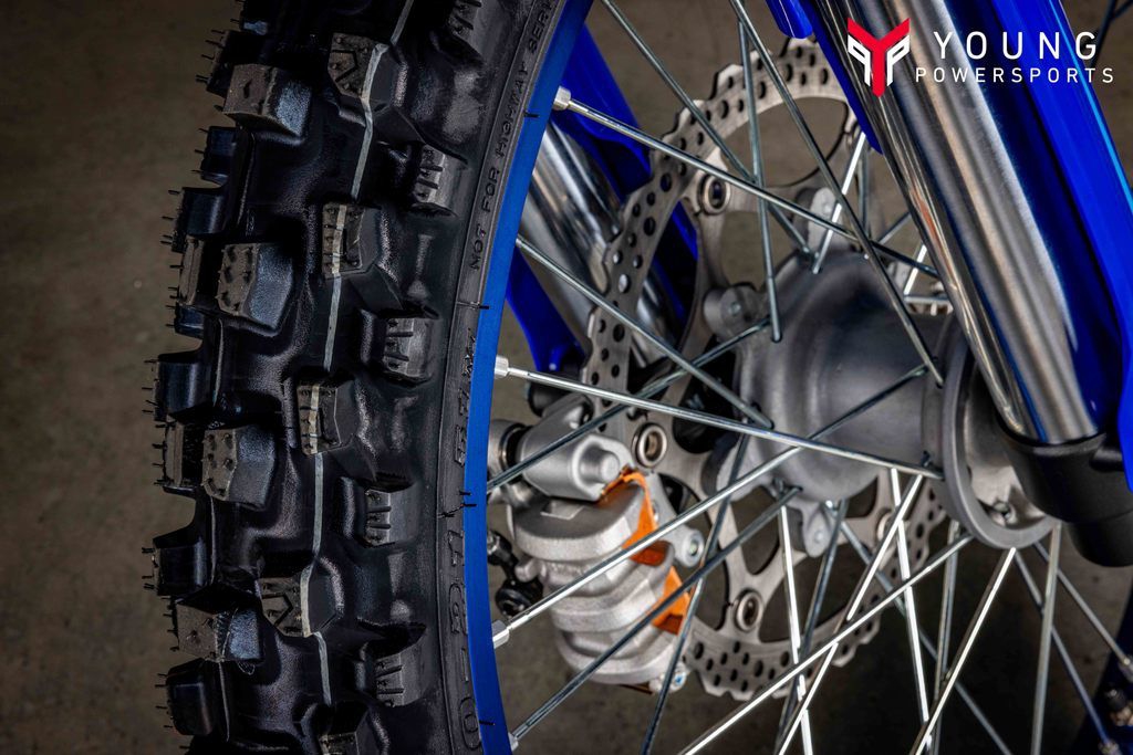 The YZ450FX's 18-inch rear wheel comes laced with a three-cross-spoke pattern for improved impact absorption and rider feel.