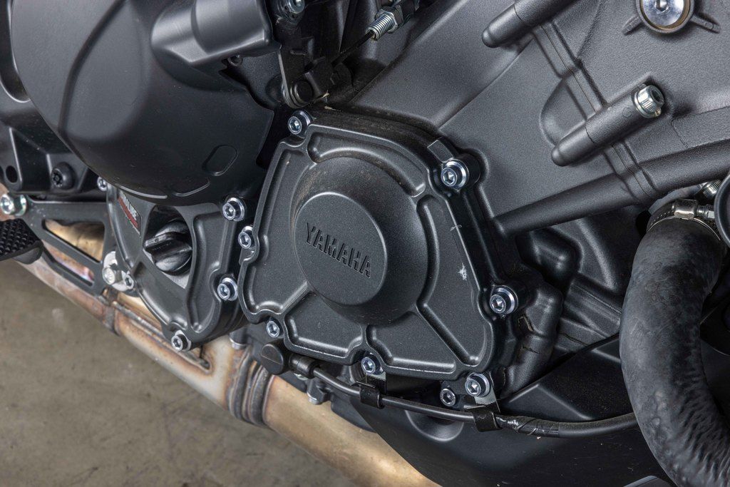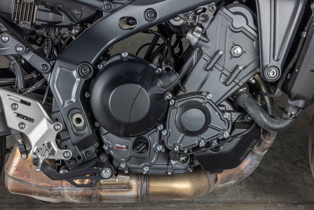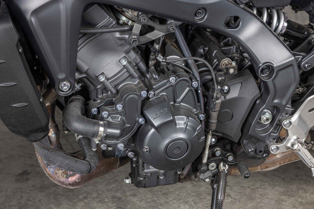 ENGINEThe MT-09 features a newly developed 890cc liquid-cooled three-cylinder, DOHC, four-valve-per-cylinder fuel-injected (YCC-T) engine with a downdraft intake. The bore × stroke of 78 mm × 62.1 mm and 11.5:1 compression ratio provide outstanding torque with strong power delivery characteristics. Almost all of the fundamental parts of the engine, from the pistons and connecting rods to the crankshaft, camshafts and crankcase, have all been redesigned with a reduction in weight. The combination of improved combustion efficiency and lighter weight results in an impressive 11% improvement in fuel efficiency as well, from 44 MPG to 49 MPG.